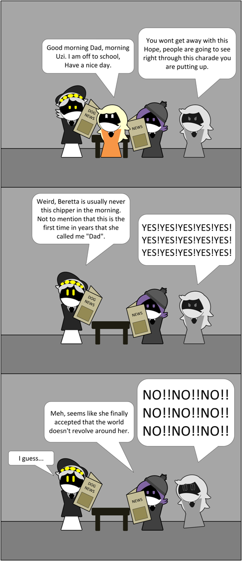 >>341499 >The walk through the quiet forest stretched longer than it should have. >None of them said it out loud, but the feeling sat heavy in their chests. >This was still a trap. >Uzi kept her railgun half-raised the whole way. >V walked sideways like a crab, her wings twitching. >Even N’s tail only wagged half-heartedly, his smile a little too fixed. >Strawberry led them with her basket swinging. >Three more identical bodies flanked the group, all moving in perfect sync and collective calmness. >"[polite tone] My Place is safe. You will see.” >Uzi muttered under her breath, “Yeah, that’s what every horror movie villain says right before the jumpscare.” >When the trees finally parted, they stepped into a low, wide building half-hidden by vines. >The metal walls painted soft green, windows glowing warm yellow. >It looked like an old agro-station, but cozier. >But still didn’t shake the trap feeling. >Inside, the air smelled like strawberries and warm circuits. >Uzi’s visor flickered. >She raised her hand, Solver symbol glowing purple on her palm. >“Let’s just make sure you’re not...” >She flicked her fingers at the lead Strawberry drone. >ERROR: OBJECT NON-INTERACTIVE >The purple glow fizzled out like a dead lightbulb. >Uzi’s eyes widened. >“Okay, nope. That is NOT normal.” >Her voice jumped, trying to sound angry instead of worried. >“So she’s either using it or infected.” >V’s cannon arm snapped up instantly. >“Told you. I vote we shoot her and leave.” >N stepped between them, hands out, voice soft but steady. >“Wait guys, she hasn’t done anything bad yet. Maybe she’s… different? >Like how I’m nice but also... yeah.” >Strawberry tilted her head, voice flat as ever. >She gestured with six identical arms at once. >“Each clone will point you to yourroom." >"Please follow them and don't cause any commotion.” >One Strawberry pointed left. >One pointed right. >One pointed straight. >All four smiled the exact same tiny smile. >"[helpful tone]Rooms ready and safe.” >Uzi grumbled the whole way down her hallway. >V’s hallway was silent except for her claws scraping the floor. >She kept glancing back toward N’s direction like she was worried for him. >N followed his guide with a nervous little laugh. >“This is still vacation, right? Kinda?” >They each stepped into their own small, cozy room. >Soft lighting, a low bed and a tiny table. >The doors hissed shut behind them locking them with a gentle click. >A minute later, every door panel lit up with the same message, spoken by every Strawberry at once through hidden speakers. >"[slightly embarrassed tone] Your clothes are dirty." >"Please remove them." >"Will wash them. Spare pajamas on bed.” >Uzi’s voice echoed from somewhere down the hall: >“EXCUSE ME?! You want my hoodie?! Pervy hive mind...” >V’s reply was colder. “Touch my jacket and I turn every copy of you into Strawberry jam.” >But… they were tired. >And the pajamas really did look soft fluffy black ones with little battery skull prints for Uzi, sleek gray with tiny wings for V, and bright yellow with cartoon dog for N. >After a lot of muttering and suspicious glares at the ceiling, they changed. >On the table in each room waited a tray: neat stacks of charged battery packs. >But the star of the meal was a tall glass of oil swirled with real crushed strawberries and tiny bubbles that rose like soda. >N took one cautious sip and his eyes lit up. >“Whoa… it tastes like… strawberry lemonade but also warm engine oil? >That’s genius! How did she...?” >They ate and drank. >The oil was weirdly sweet, fizzy and exactly the right temperature. >Even Uzi admitted (very quietly) that it was “kinda not terrible.” >V drained her glass in one go without a word. >Lights dimmed automatically. >The rooms felt warmer and safer. >N flopped onto his bed in the yellow dog-ear pajamas, belly full and his wings relaxed for the first time. >“Okay… maybe this isn’t so bad for a vacation.” >He yawned. >The vent above his bed clicked open. >At first it was just a faint hiss. >Then strange glittering particle began drifting down like glowing dust. >N blinked and vision already going fuzzy at the edges. >“Aw… pretty…” he mumbled and smiling sleepily. >The particles thickened. His room filled with them. >Suddenly, right in front of his bed, three fluffy golden retriever puppies appeared wagging tails, big eyes and their tongues out. >One jumped onto his chest. >Another licked his face plate. >The third dropped a stick at his feet. >N’s tail thumped hard against the mattress. >“Puppies…? Real puppies…? This is the best vacation ever.” >He reached out to pet one, laughing softly and completely unaware that the particles were still pouring in thicker and thicker. >From the hallway outside, faint synchronized footsteps echoed as more Strawberries moved into position. >"[quiet satisfied tone] N is happy." >"Good, time to serve the other guests.” >But in the vents, the particles kept falling and the puppies kept multiplying. 3/?