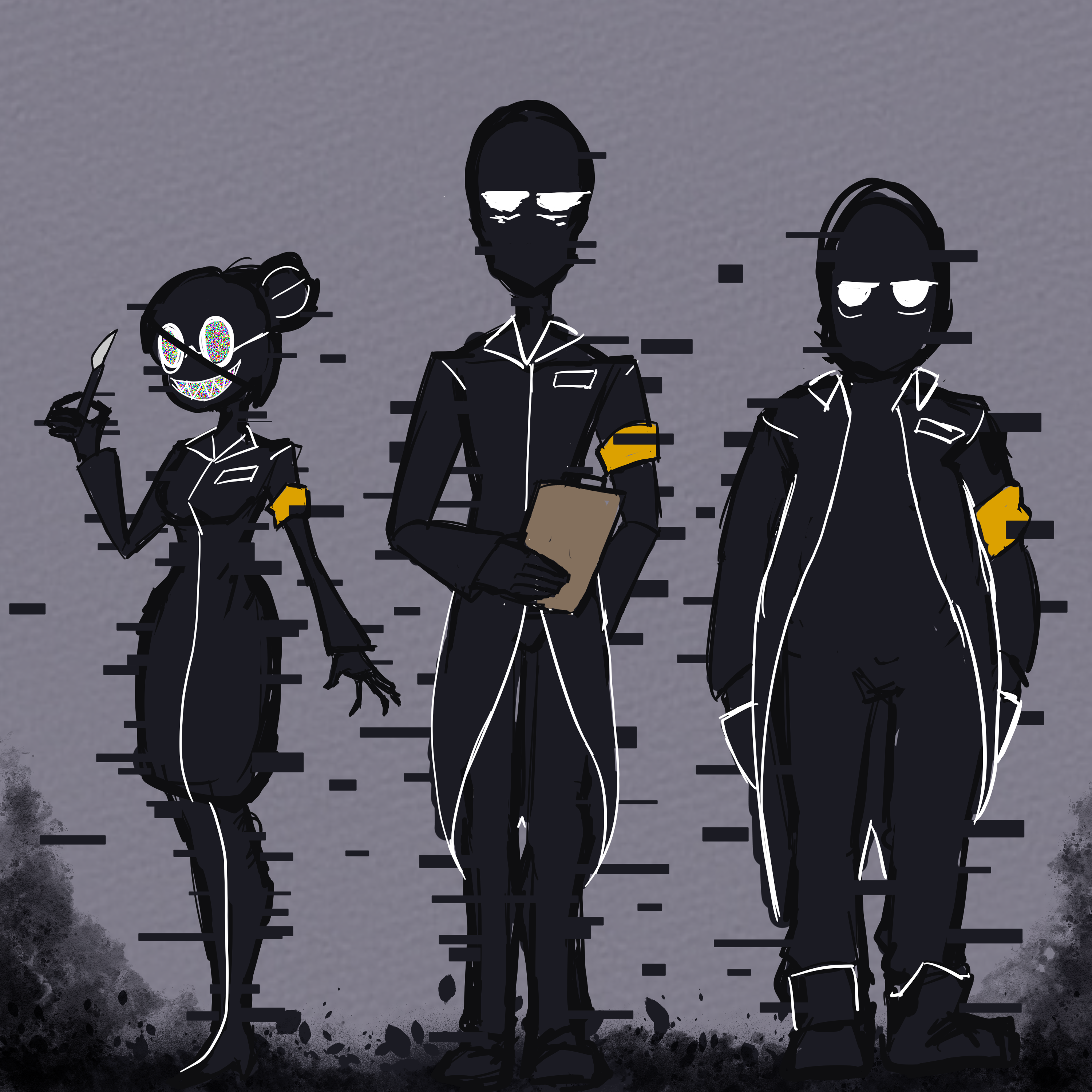 >>340951 Here's that original earliest lineup. Mahonia is the kind of schlubby, overweight stereotypical professor type, you'd never suspect from looking at him that he's an ice blooded sociopath. His tenure in Calibern started before the JCJenson merger as a lower level lab technician where he was caught syphoning experimental drugs from the company's stocks to perform his own unauthorized and unethical human trials. Eliza's father saw his potential value and offered him a choice between working on whatever shady and unethical projects Calibern needed him to or a long fall from a shuttlecraft into Oslo-2's ocean where his body would never be found. Hawthorne is mostly a bureaucrat and administrator, and would only charitably be described as a basically competent scientist. His skills lay mostly in assembling teams of other people who do good work and then positioning himself to take all the credit to fuel his personal advancement. He was the favorite to advance as overall head of R&D until Edmond's death and Eliza's abrupt seizing of total executive control over Calibern. Hawthorne and Mahonia both hate Holly and probably would have tried some kind of corporate coup against her if she wasn't making them both rich and if she hadn't intimated that she'd happily have both their throats slit if they stepped too far out of line.