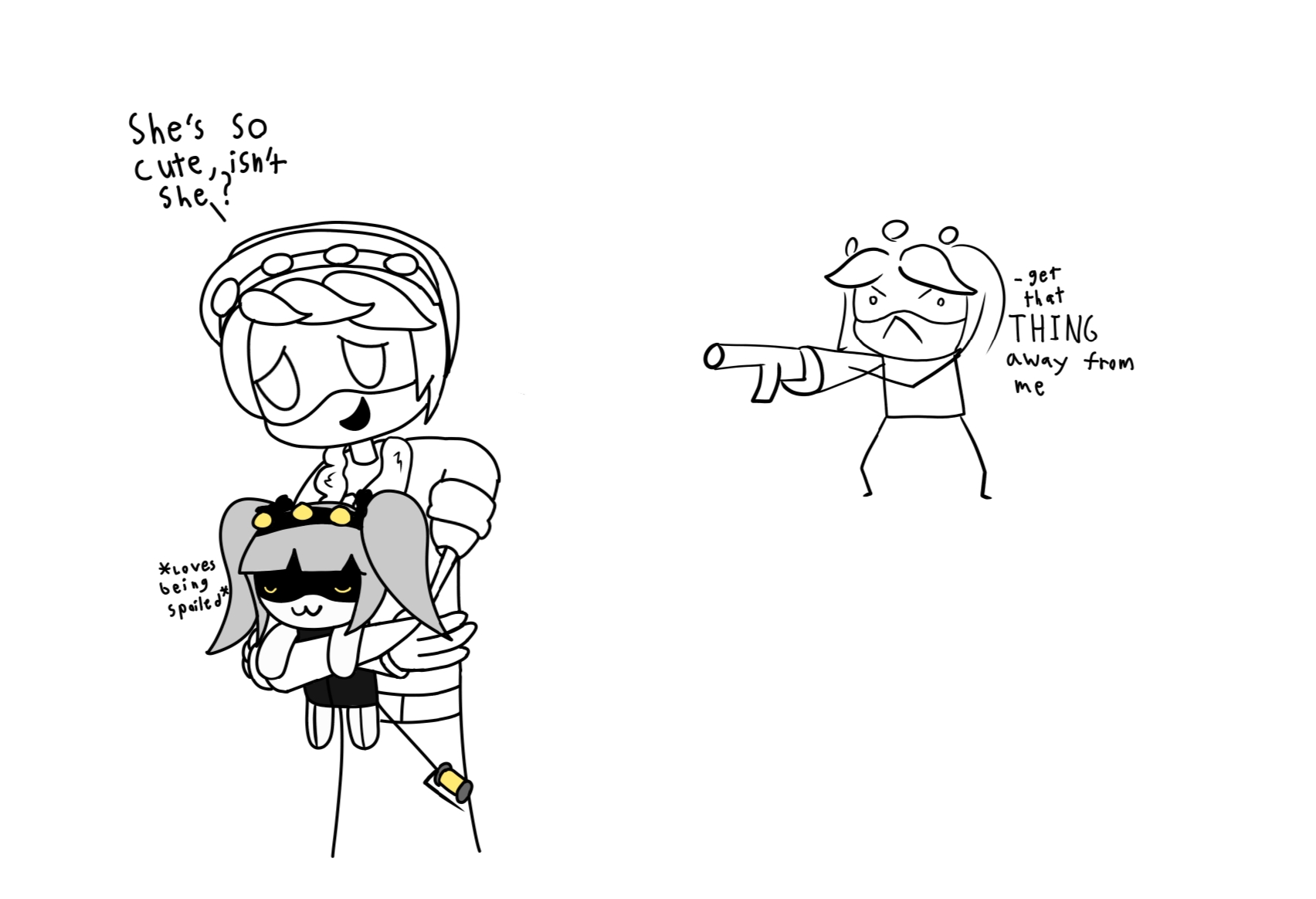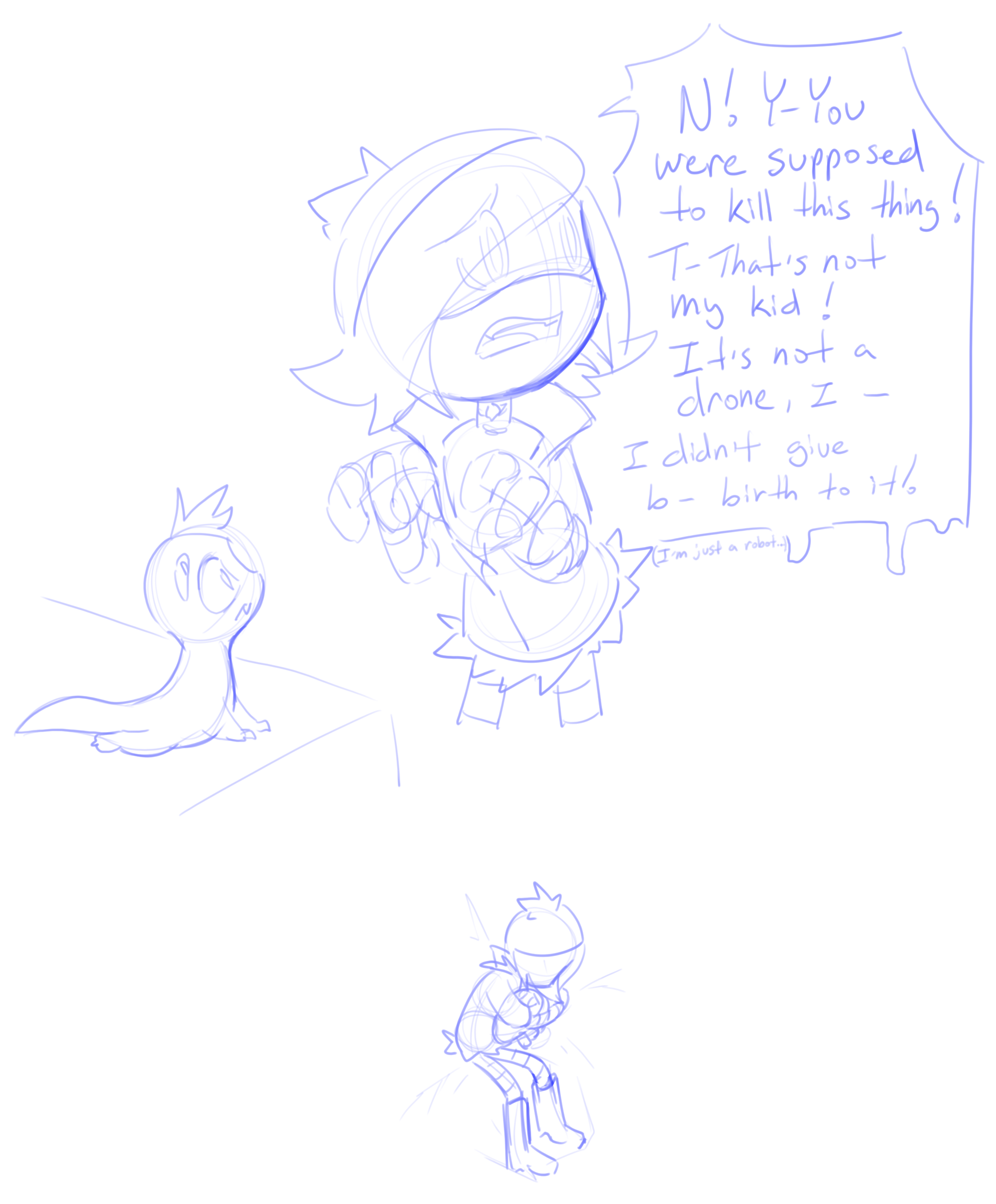 Solverpede Beretta being really protective of her Solver sapien brother Mac since he's too soft and squishy to fight off Femanons, only flee and/or hide from them: how cute is this?