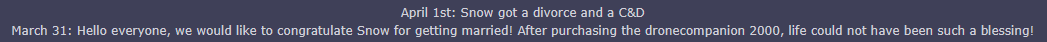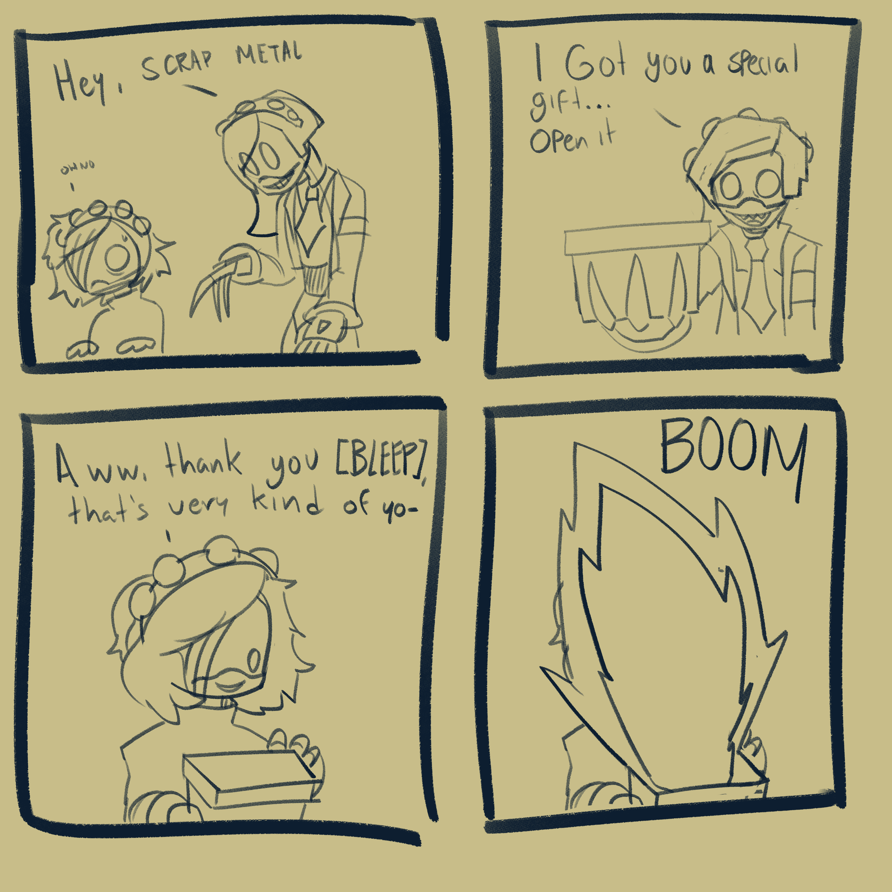 >>346384 >It was the happiest day of her life >Emily, radiant in her dress, could think, could feel nothing but the groom, his eyes upturned in familiar joy beneath the Jenson-mandated censors >It has been... >a long time >Countless nights of dreaming, wishing day after day for just the hope, just the chance to prove herself to her makers >And then that fateful night: a survivor, Anon, crashing into the camp like a stricken god >The wit, the grace he displayed even wounded! >The terror, primal and raw, as you both ran in maddened frenzy from glow, violet-yellow fading into the distance! >The grief of knowing: watching him explain himself as the last, not only of the company but of the gods themselves. Of seeing someone so strong crumble under the weight of his responsibilities, his desperate hopes to at least avenge the people he could not save. >The love of being trusted to know... >All of it coming to this. This moment. This perfect second >At the end of aisle >It's enough to- "Emily" >His baritone echoes through the cathedral, every syllable dancing across tongue and pew alike till it finds rest in the depths of her core "Thank you" "You don't know how hard it was on my own... how close I was to giving up" "How long I spent hopeless and defeated before we met" "How long I was alone..." >He pauses, a shuddering breath ripping through him under his sheer sincerity "The labs, the Patch, I never could have, never would tried to make it without you" >His massive arms reach down beneath her own, gripping, lifting up and up and up into a hug so tight even her steel struggles under the strain "Thank you for being my best friend, for making my greatest dreams come true" >Emily leans forward >Into thin air? >Why did he put- "For bringing Doll into my life" >no "I mean I can't believe it. 'Compatible reproductive systems' is insane right?" >NO "I can fix this, can save my bloodline, my entire race even! And it's all thanks to you." >N O WAIT WHYCAN'TSHE "That research you discovered? It changed everything. And I'm so glad you agreed to be my best man" >A shadow falls over her form, cold and commanding "I mean, I know things are going to be hard. For both of us given... everything" >The viper stands beside him now, rictus grin >She's salivates, long strips of nanite-drool puncuating every greedy breath, like she can't take in enough of him, like he's prey >But worst is when he gently grasps her hands... "But you've shown me that 'hard' doesn't mean I should give up" >Her hands grip slow, then tighter, then tighter still till Emily can see his bones at the limit of their integrity, like if she didn't he would slip away >Emily doesn't know whether it's better or worse that she too has eyes only for him "The rings?" >Her body moving on instinct, on hope, to serve >She tries to object >to speak >to move >to at least shut her eyes, to do anything but WATCH as Anon is joined together with a monster >Tears streaming down her face, her overload ends at the vows "Do you take this man to be your lawfully wedded husband?" [Da] "And do you, Anonymous Man, take Doll to be your lawfully wedded wife" >She wants to stop him >To scream >But then he looks at her with those eyes >It's the happiest Emily's ever seen him "I do" >She collapses, great heaving sobs ripping from her vocoder amidst the celebration >She can't >She just CAN'T AND- >A stranger wipes the pixels from her screen >Looking up through tears and optical errors alike, she can barely see, but can see it isn't him, that it never will be >The (bridesmaid?) helps her to her feet, pulling blue close to red as their optics meet >The last Emily sees is her fanged maw smiling impossibly wide, chomping down to swallow her whole "April Fools!"