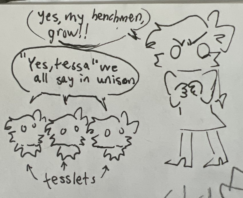 I think about the cat part of S too much and often forget that she's a functioning DD who can talk and have complex thoughts and stuff. Just that she probably does so while flopped upside down or stretching across your lap. She's probably the smartest member of her team, just so quiet and relaxed that it rarely shows.