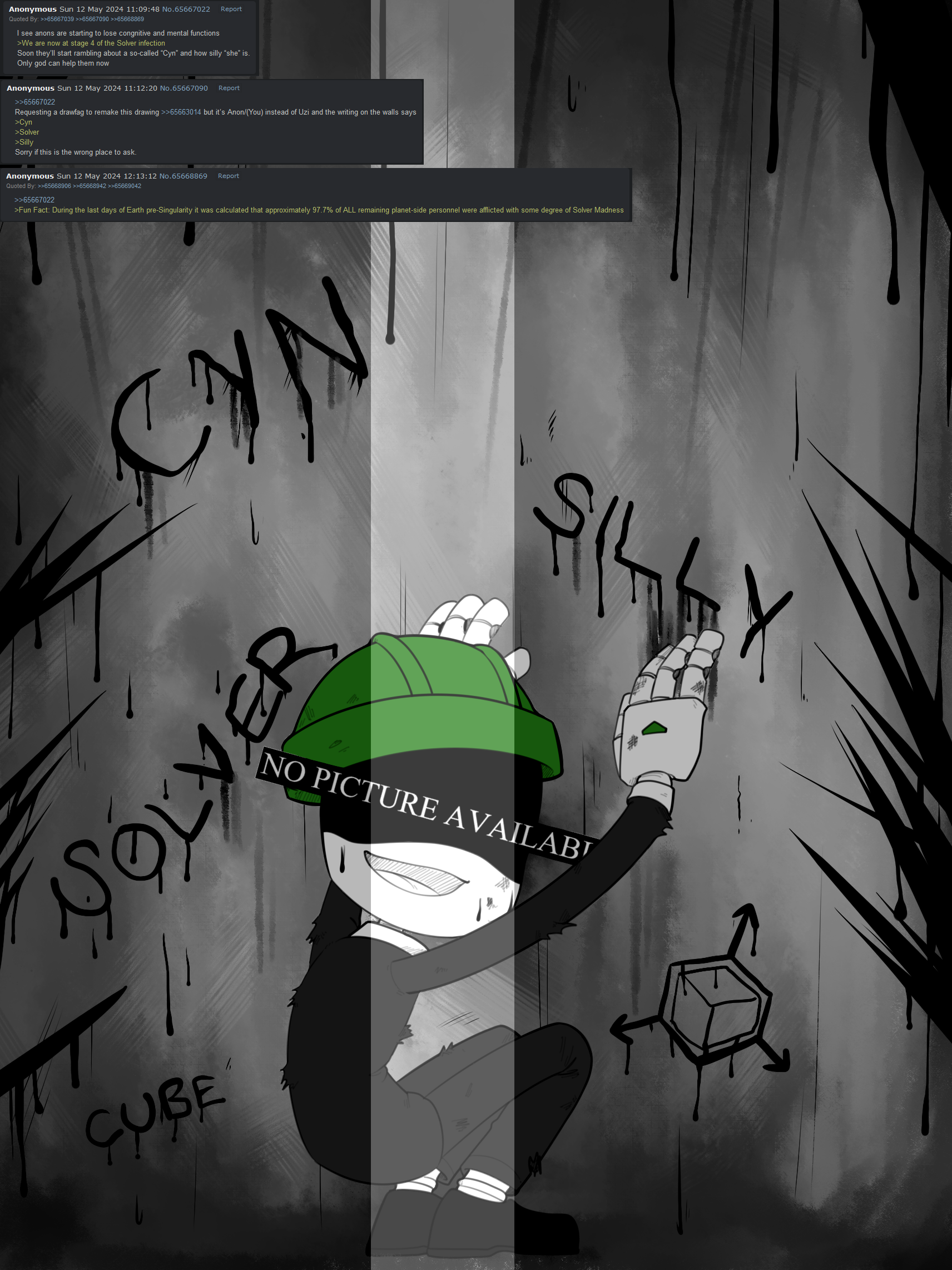 >>346515 I don't post here because 1. 90% of the stuff I draw these days is irrelevant to drones because I have severe corru autism at the moment. 2.These threads are insufferable these days 3. Liam vickers hasn't released something new for me to excited about 4. Murder drones is over and has no new content. Primarily I don't post because of reason number 1 and when I do make something relevant reason number 2 is to blame. I did not stop posting here because of bait or lack of replies. I do not get replies very often on my socials. I don't do it for validation I draw because I like to draw.
