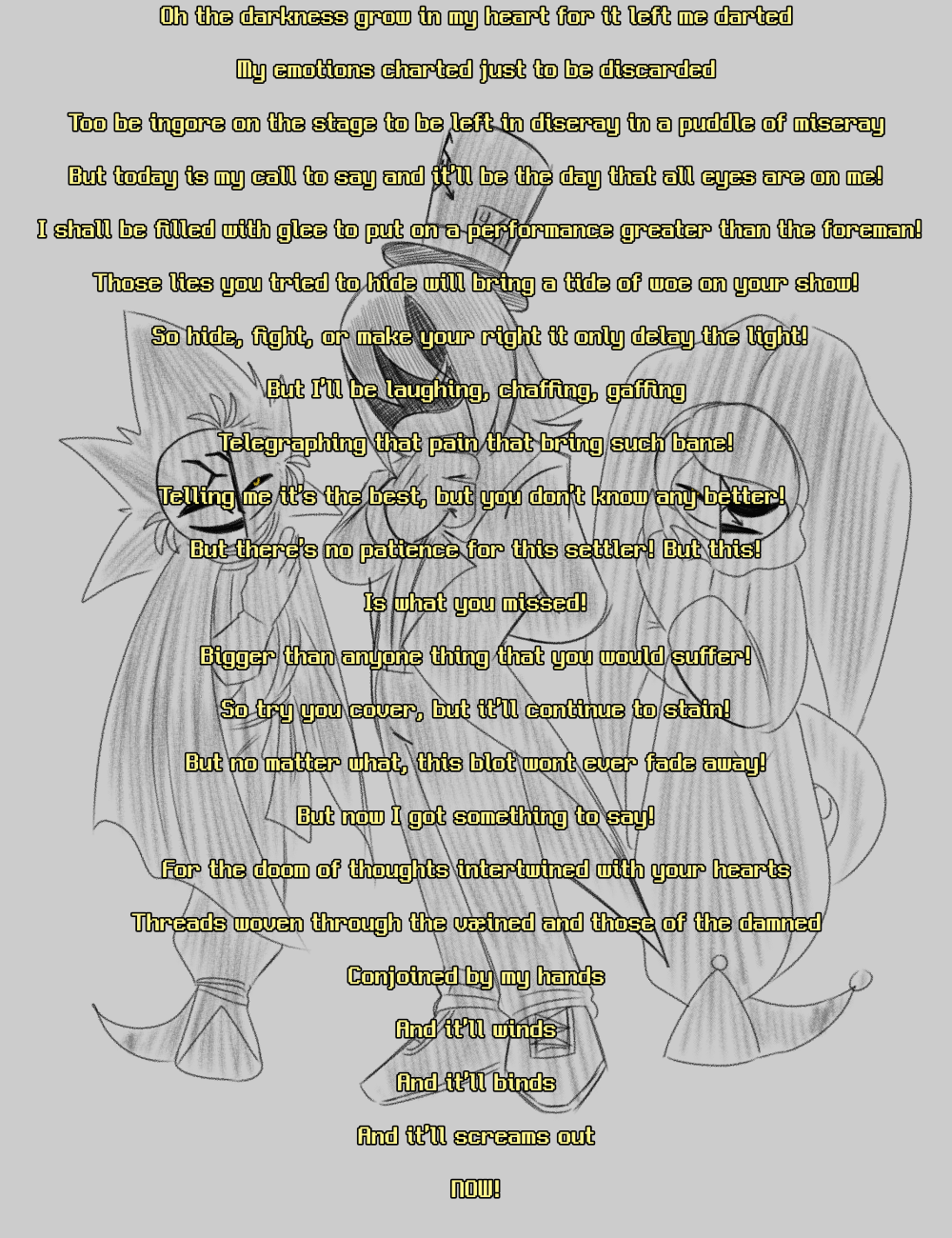 So what bodies would Caine make for MD characters' mind files that perfectly reflect their psychological profiles (i.e. their traumas and neuroses and general damage)? Some thoughts I had: >Pomni: goblin in spiky armor (that she can't take off) >Lizzy: snake (from her "taking a dead body to school"-level guilt over Doll) >Doll: spooky Japanese-style ghost (just like she is already) >Nori: gross little bug creature (ditto) >V: N/A, Caine is unable to generate a body that meets his content guidelines