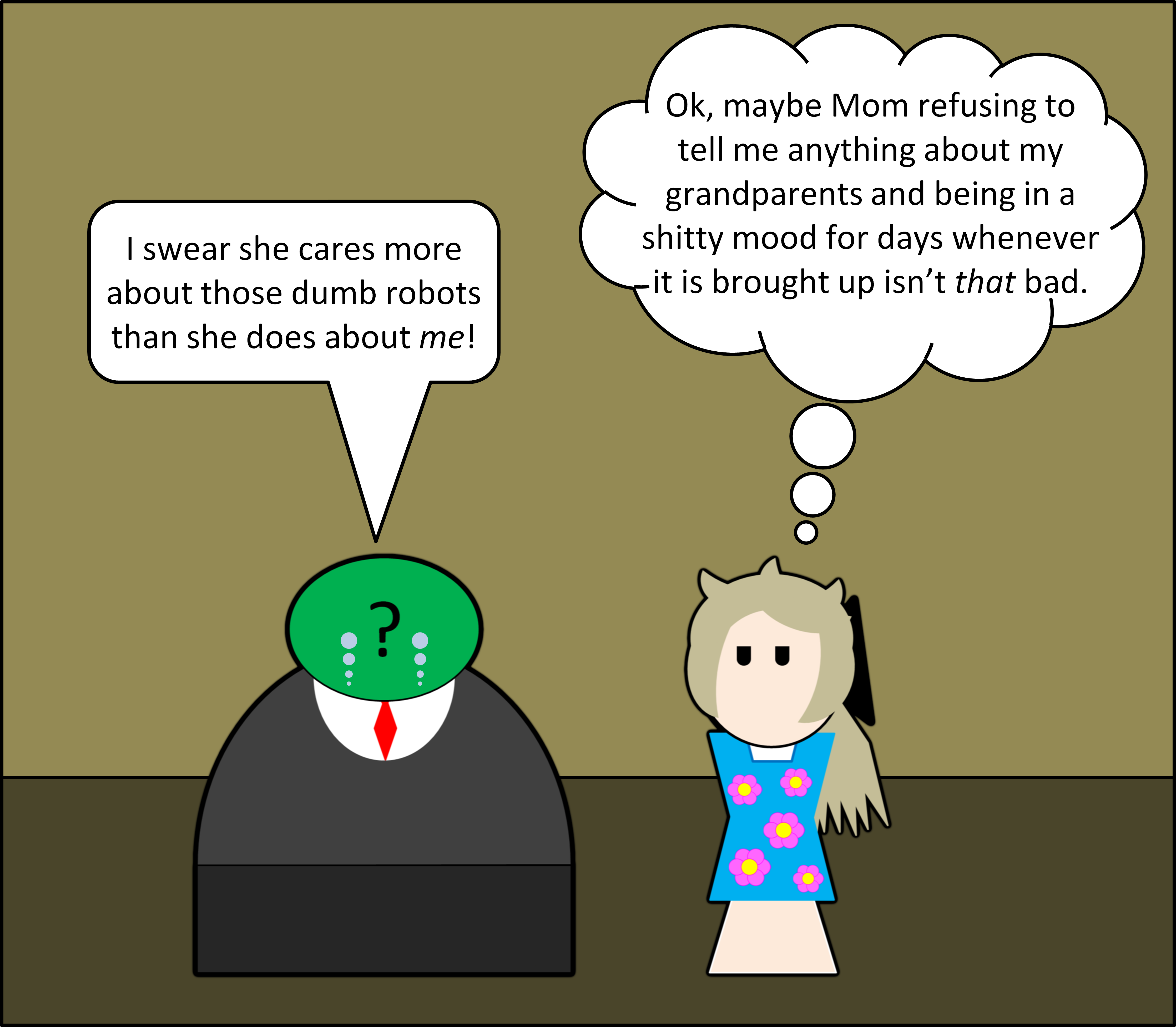 FUCK YOU CORPO I'M PRESENT AT EVERY DINNER AND SOME BREAKFASTS AND SHE TOLD ME NOT TO COME TO LUNCH ANYMORE. Just cause I have an, urgh, job dosen't mean I don't talk to her! She just won't listen! And unlike MY dad when she wants space I'M not gonna storm into her room and start shoving "family bonding" at her!