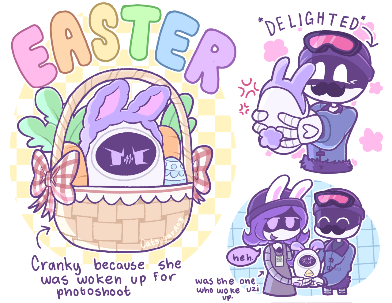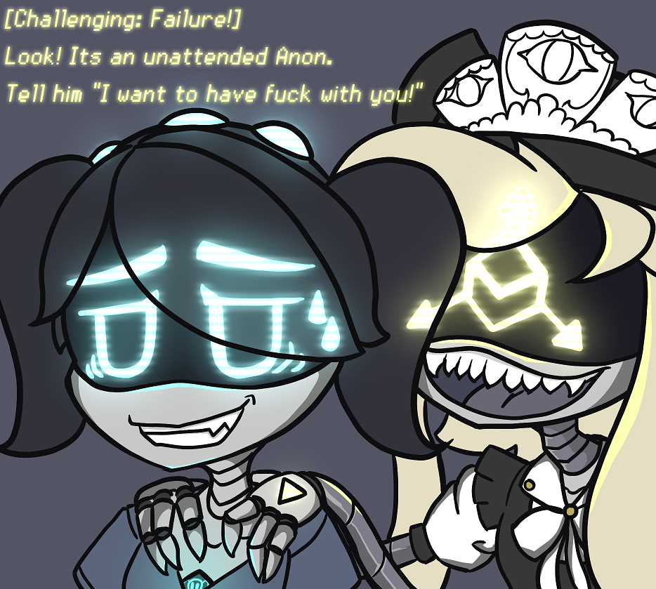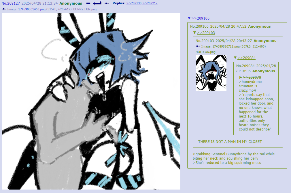 >>347304 >It's easter sunday in the drone board. >But some dumbass pandemic called "Fluffy Tail Syndrome" hit us from Teli germs. >It turns every drone into a walking easter decoration or your core starts overheating and you reboot as a literal chicken bot or a decorated pillbaby. >No one wants the cluck life or return to diapers bot era so we all just roll with the mandatory personalized bunnysuits. >Masqy shows up first in the cutest goddamn bunny suit you've ever seen. >A fluffy pastel pink, little heart-shaped tail, ears so perfectly sharp like knives and an aura to brighten up the mood. >All she does was hopping around. >Pidge was next wearing the absolute stinky abomination that is a bunny-pigeon hybrid suit. >She keeps making weird coo-honk noises and trying to "fly" by flapping her noodles arms. >It was hilarious watching her fall on her face every time. >Jane was found flattened by Bunnysuit Bonnie big booba. >Strawberry? nowhere in sight. >Turns out it's ALSO her birthday today. >Poor girl is stuck in her home wearing the strawberryfruit bunny suit without acknowledging the pandemic. >She's sitting alone at a table with a single candle made of scrap wires. >Singing happy birthday to herself in the most delusional voice possible. >"Wow guys thanks for the surprise party, you shouldn't have." >Empty chairs, zero guests, full cope. >Must suck having your birthday land on easter every year. >SD-E comes sliding around the corner in the banana bunnysuit. >Keeps slipping on her own peel-trail and faceplanting into egg piles. >Then there's pavo. >The virus gave him straight-up eggnancy. >Yes, male pregnancy but with eggs. >He's just casually laying colorful easter eggs every few steps. >Plop. >Blue one with stripes. >Plop. >Pink glitter one. >He's basically a living easter basket at this point. >Then there's the only one who is immune left. >Anon watching the whole circus from the sidelines. >Decide the only logical thing is to make it worse. >"Hey masqy and pidge, let's play where's waldo" >They both immediately agree because bunny-brain pandemic. >Rules are simple: they hide, i find them. >Except every drone is in a stupid bunny suit so the whole colony looks similar. >Masqy vanishes first. >Spend twenty minutes checking egg bushes and behind E's banana peels. >Nothing. >Pidge is easier, the pigeon cooing and the vomit gives her away instantly. >Find her half-buried in a pile of pavo's fresh eggs, grinning like an idiot. >Treating them like her children waiting to be hatched. >Then where's...? >Masqy was literally standing two feet behind me the whole time? >Just silently vibing in her cute suit, ears flopping and that adorable tiny smile. >She was "hiding" by being too adorable to notice. >Pavo drops another egg right between my feet as a participation trophy. >The bunny pandemic turned easter into the most cursed holiday in drone history. >Still better than clucking though.