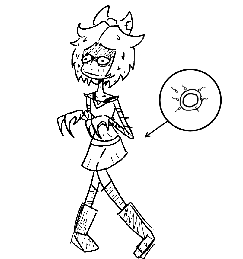 Jame's Human Sperm >small and cute but vulnerable, most die or get lost on their way to the egg >750MB is jumbled genetic code, mostly junk >takes half an hour or more to get to their destination- if they do >singularly focused on their goal, not very fun >5% survival rate over 5 days >only one tail flagellum for propulsion N's Solver Sperm >1000x the mass of human sperm >terabytes of N's precious genetic data and forbidden eldritch knowledge >swims to their destination in seconds with their billions of friends >happy haploids, like to play with each other and other spermatozoa but accidentally hurt those so much smaller than them >100% survival rate, 100% impregnation rate >three tail flagellum tentacles with triangular ends, look like the solver symbol when viewed from a certain angle >will tenderly wrap their tentacles around an egg as they join to make a diploid cell >the other gametes will cheer their friend and patiently wait for the next egg to arrive, ensuring continuous pregnancy Louisa >a human factory for birthing more Ns >how did you think new copies were made? >you will not be discarded >pregnant forever
