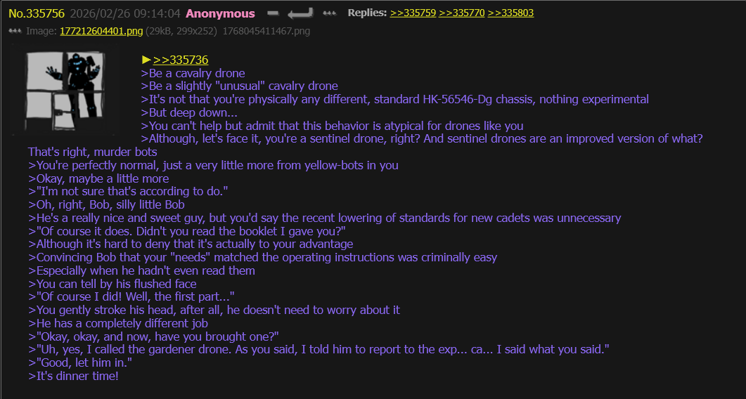 >Be you, Anon. >Living in the age of technological prosperity. >Your life has become easier and boring. >You rely on your drone a bit too much. >You want to shake off this existential dread. >You think of going on a walk. >But drones can either hold you up or fly you to your destination. >You didn't mind the drone invasion and being ruled by your benevolent overlords. >But there's something you can do on your own, right? >That's when an idea stroke. >Either swimming but the temperature is a bit cold. >So fishing, yeah drones in your area aren't waterproof. >So you go fishing. >Hours passes and still nothing. >Then an old drone passes besides you. >"What are you doing young man? The fishes in this lake already has been caught by the new fishing drones model." >"Goddammit. Drones has beaten me again. Is there not much i can do anymore?" >"Although, the fishes this day were attracted to old audio recordings of whining and bitching. Try that" >You give it a try and said the most outlandish cry of all time. >"April fools, This recording will make me a fortune." >"Bitch, April fools was yesterday." >You return home even more sad and defeated. >"Anon, I noticed you've been down lately. How about you be the boss for today?" >"No, it's fine. You can take care of me even more." >"Sure, I want to watch this new viral video seems you're on it." >"CLANKER, DON'T YOU DARE OPEN IT."