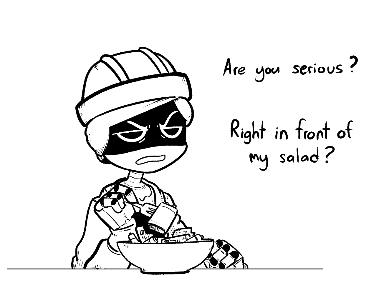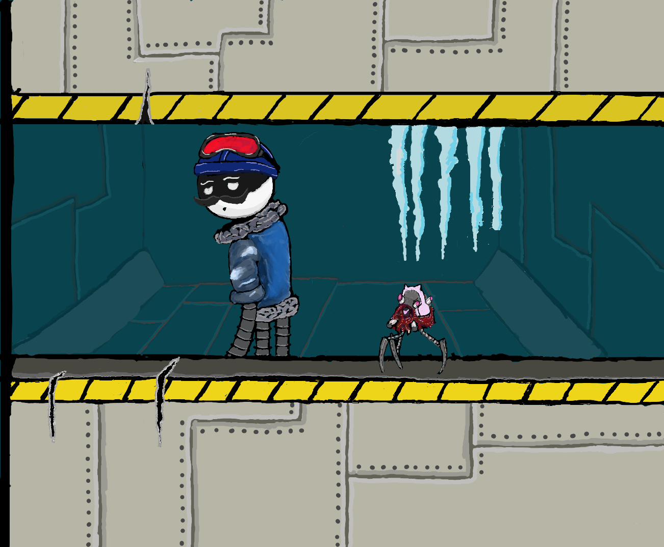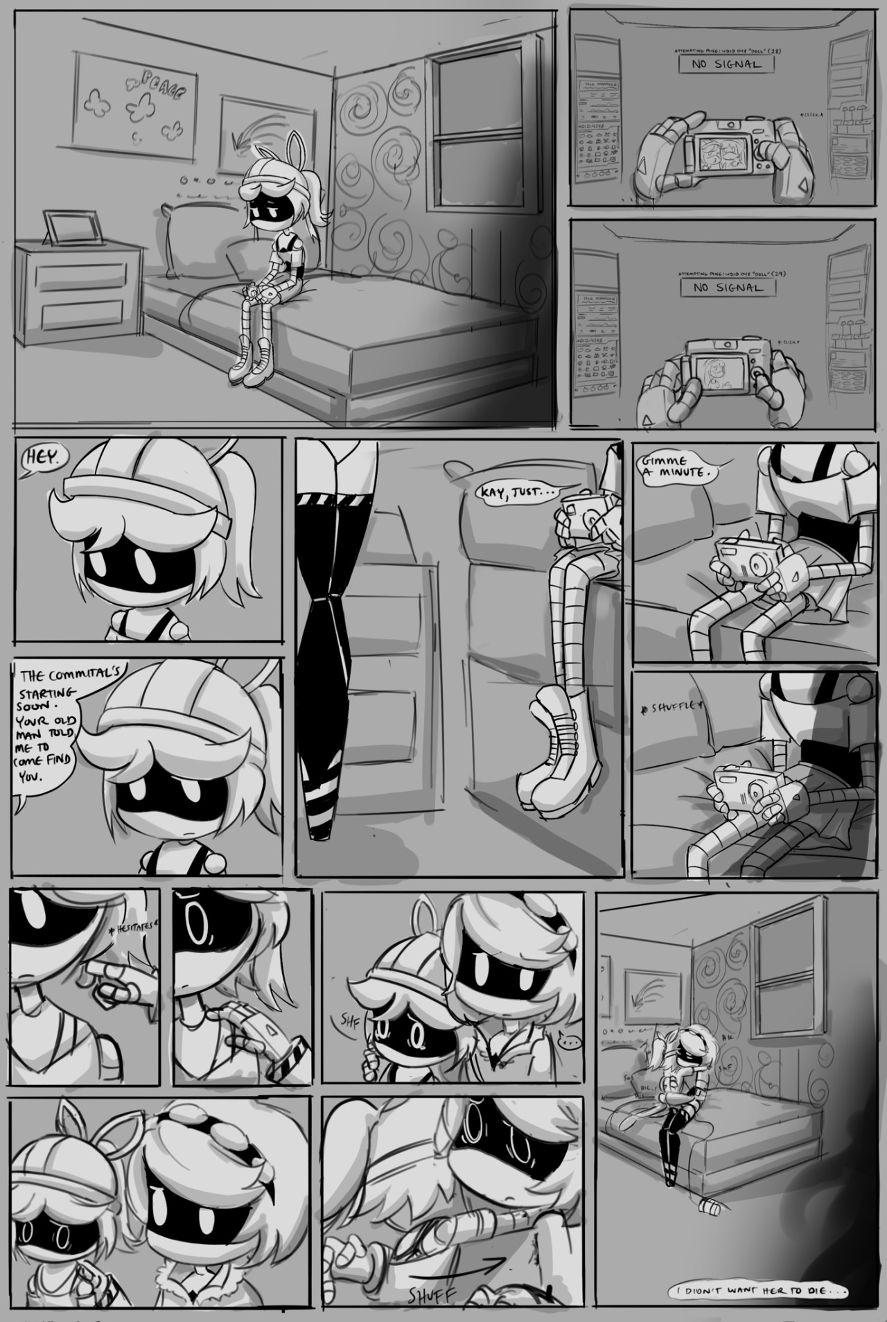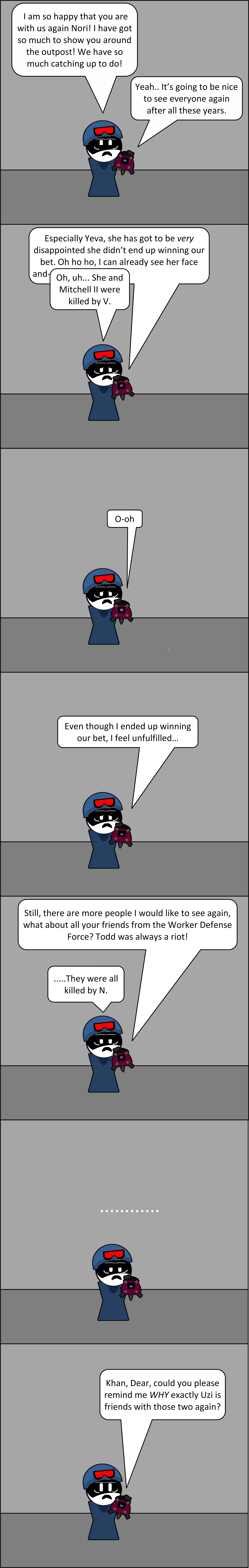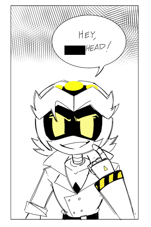 >N457 averts his gaze once more, embarrassed with what he just blurted out. This drone stares death in the eyes on a daily basis, yet this little lady has him out of his depth. He's never had to choose his words this wisely before, even when face to face with a furious Jones. >...Jones. Oh, what he'd give to get chewed out and beaten up by him right now, it'd be less of a hardship than this. This nearly 7 foot tall automaton is shaking in his boots at the thought of spilling his feelings. >Masqy breaks the silence, derailing the juggernaut's train of thought, "...Thanks." >"What?" >"I said... uh... I appreciate that you're..." she stops, feeling a bit flustered. He eagerly waits for her to finish, ecstatic that he's not the one going first. >"That you're worried about me." She raises her voice slightly, taking on a more confident tone. He's always wanted to hear this, but now that the time has come... he can't accept it, his walls can't come down so suddenly. >"Hey, I never said-" Juggernaut No. 457 bites the tongue he doesn't have. No, there'd be no point in that. He needs to be honest, not dismissive. >"...Just doing my job." >The two sit in silence, a thousand thoughts running through both their minds. >The juggernaut makes up his mind first. He's strong, real strong, strong enough to say what needs to be said. He doesn't want to do it, he can't, he's nervous, he feels like he's sweating, though he has no sweat glands. >What is he supposed to do? Should he let this opportunity pass him by? He doesn't want that, now's the right time and place. They have privacy, they're bored, they're...