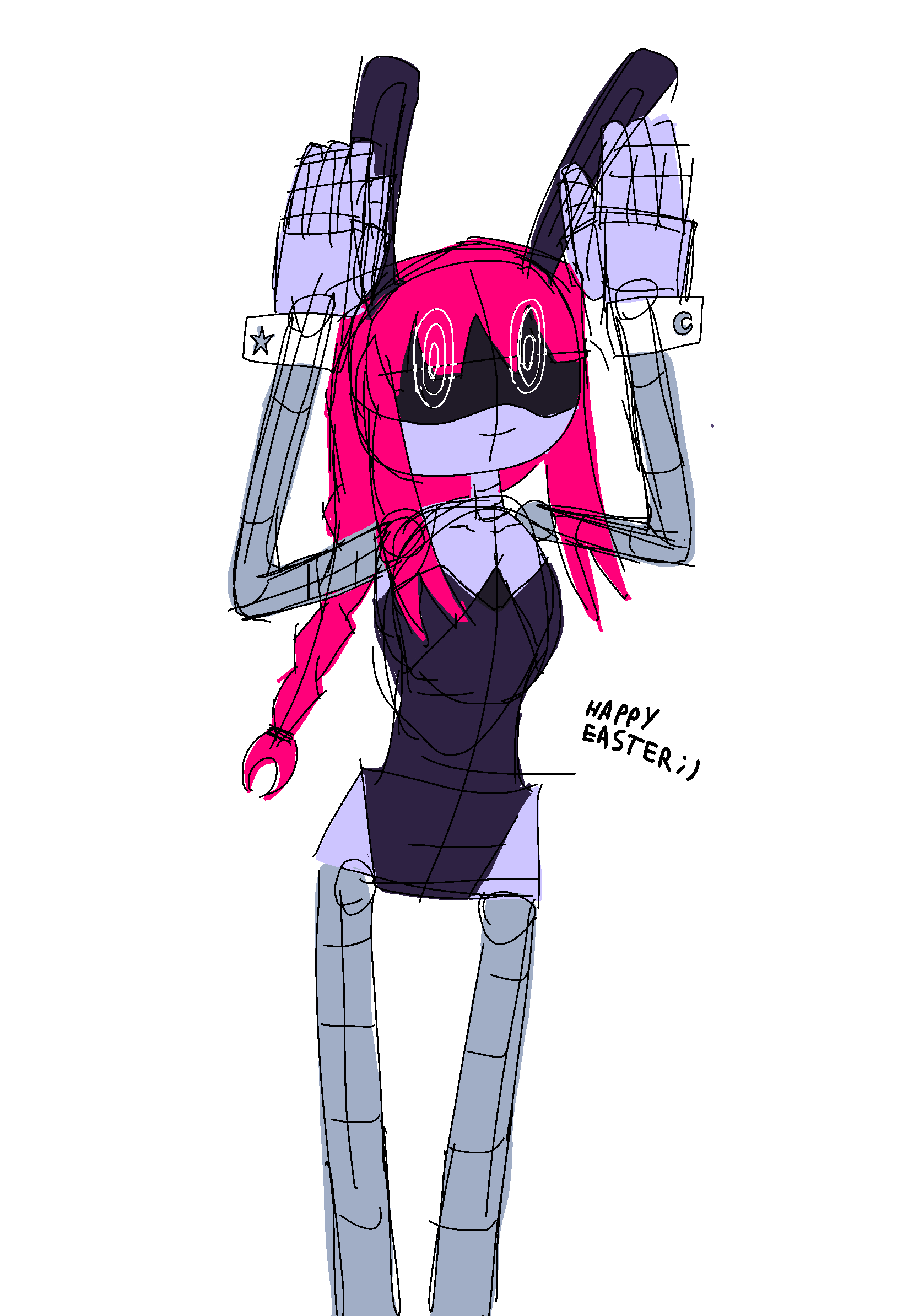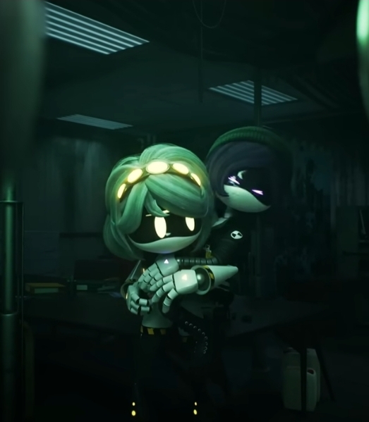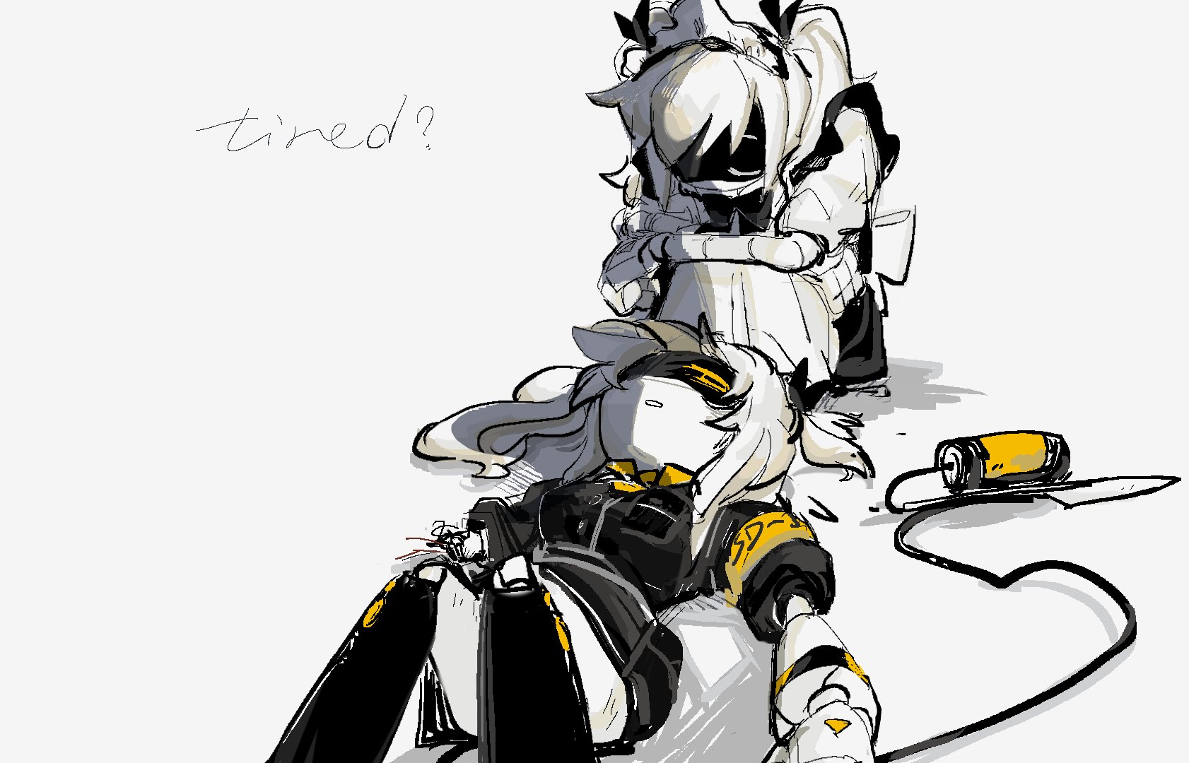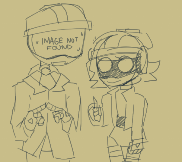 >As the big fella gets ready to leave, he hears a soft voice call out to him from behind. >"Where... are you going?" Masqy yawns, rubbing her baby pink eyes. Her monitor flickers for a moment. >"You're awake?" the juggernaut turns around, surprised to see that he's not the only one who's sleep-deprived. >"Yeah..." Masqy blinks. Somehow, her eyes feel dry. Who programmed that and why? "Just a little... nervous, is all." >"Nervous?" 457 sits down, inching closer to his petite companion, "With me by your side?" >A faint smile plays on the worker drone's nonexistent lips, "Weren't you about to leave me by myself?" >"Oh, come on, I was gonna guard the camp!" he whisper-yells, his normally blank eyes now displaying remorse. He does tend to become more expressive around her. >"Sure." Masqy stifles a laugh, placing her hand over her mouth. The big guy rubs the back of his head, feeling a little guilty. He did plan to stay near the tent, but leaving something so vulnerable alone and defenseless would still be reckless, even if he was nearby.
