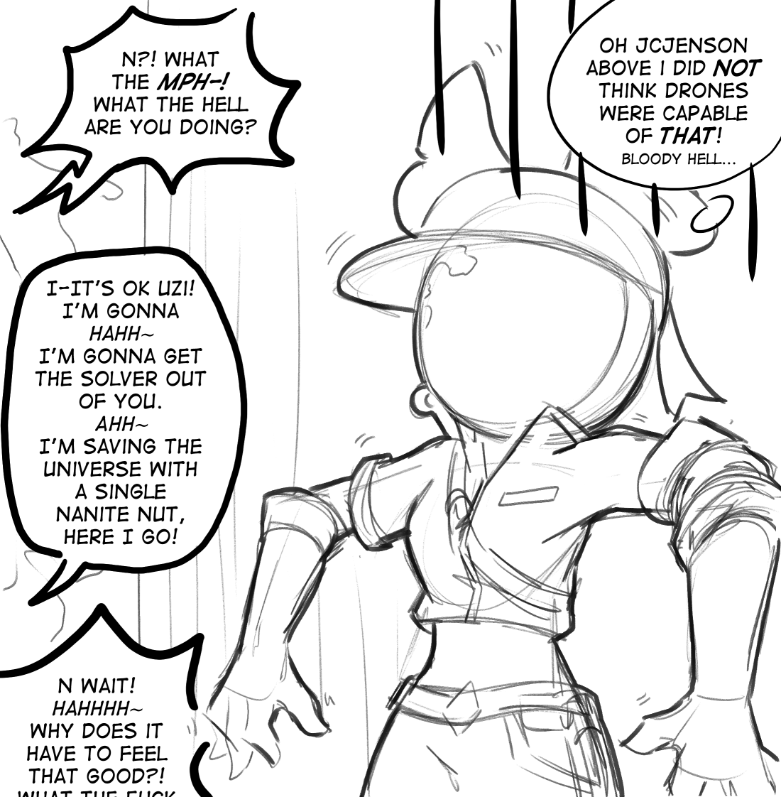 >The little drone's gentle touch is unlike anything 457's ever felt before. It elicits a low groan from him, a sound that surprises both of them, "You're such a tease..." he slowly tears off her sweater. >Only now does the little drone realize what she's gotten herself into. This beastly... drone, if you can even call it that, is about to ravage her fragile body, ruin her! ...The thought alone drives her crazy. >"Now he reaches for her skirt. It's happening. They're about to have the night of a lifetime... >NOT ON MY WATCH! I'M PUTTING A STOP TO THIS TOMFOOLERY! >Jones appears, or, to be more precise, has been sitting inside the tent this whole time. Nobody noticed him because he's Commander Jones. He leaps off the chair... Wait, since when has there been a chair in the tent? >HOLY JESUS. HOOOLY JESUS! WHAT IN GOD'S NAME DO YOU THINK YOU'RE DOING, SOLDIER?! YOU CAN'T FUCK THAT LIL' ASS DRONE! >"You... Since... What? How long have you been here?!" N457 is screaming internally. >I KNEW YOU HAD A FEW SCREWS LOOSE, BUT THIS? THIS IS NASTY EVEN FOR YOU! EVER HEARD OF DICK ON SOMEONE YOUR OWN SIZE!? >"Be quiet, man!" jugg shushes his own commander, "You're gonna wake everyone up!" >OH, AND YOU POUNDING THAT POOR WORKER DRONE INTO THE EARTH WOULDN'T? WE'D FEEL THE GOD DAMN SEISMIC WAVES! >"Relax, relax!" Juggernaut No. 457 stands up, holding his arms up like he's surrendering. >CAN IT, 457! I'VE SEEN ENOUGH, MORE THAN ENOUGH! I'M GONNA HAVE TO GET SCIENCENAUT TO EXPUNGE THIS FOOTAGE FROM MY MEMORY FILES, WHAT A SICKENING SIGHT! >"Could we have, uh, a little privacy... Mr. Jones?" Masqy humbly asks. >WHO TAUGHT THIS VIXEN HOW TO TALK BACK!? YOU WANT ONE OF MY MEN DIGGIN' DEEP IN YOUR GUTS, DO YA'?! >He pushes N457 out of way and gets all up in Masqy's face. >I WANNA DIG IN YOUR GUTS TOO... AND PULL 'EM OUT! YOU WANNA GET STRANGLED WITH YOUR OWN NOODLE-SIZED INTESTINES, HUH?! I'LL SMASH YOU, IN THE LITERAL WAY! >"I don't... wanna get smashed." She whines, trembling in fear. >NOT ANOTHER WORD FROM YOU OR THE ONLY THING GOING UP THAT LITTLE ORIFICE OF YOURS TONIGHT IS MY BIG. JUGGERNAUT. FOOT! DO I MAKE MYSELF CLEAR?! >She doesn't respond. >I SAID, DO I MAKE MYSELF CLEAR? >"B-but you said not another word..." >DOOOOOOO.... IIIII.... MAAAAAAKE... MYSELF.... CLEEEEEEEEAR?! >"...Sir yes sir." >GOOD. >Jones looks at the worker drone, a sad, pathetic little thing. He feels a shred of remorse for it, so much so that he... apologizes! >...OH, I'M SORRY, LITTLE SPROCKET, YOUR SO-CALLED LOVER HAS WORKED HIS CHARMS AND GOTTEN ME RILED UP TOO. OH YES, I'M IN HEAT, AS IN BURNING WITH FIERY RAGE! >WHY, I JUST WANT TO SLAM MY FIST INTO HIS FACE OVER AND OVER. THAT'S THE ONLY TYPE OF POUNDING I ENCOURAGE.
