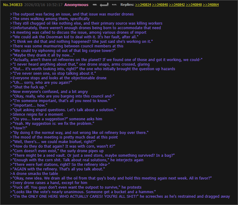 >>347782 NTA NTA, while I agree in general terms I have never once seen an example of a complainer actually improve the thread in any meaningful way. This constant whining about the same issue for the thousandth time does exactly nothing. It is useless as gatekeeping because if anything it incentivizes people to spitepost even more offtopic shit because the complainer can then be farmed for amusement. I accepted a request for a greentext about Workers trying to fight back against DDs in the spirit of adding some more "closer to topic" material to the thread, but in the end 90% because I just find the idea interesting.