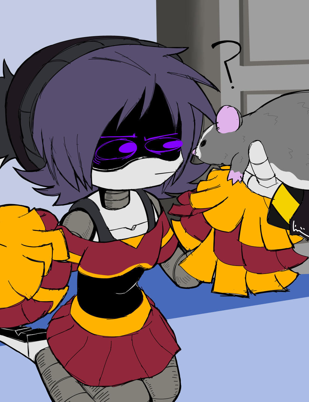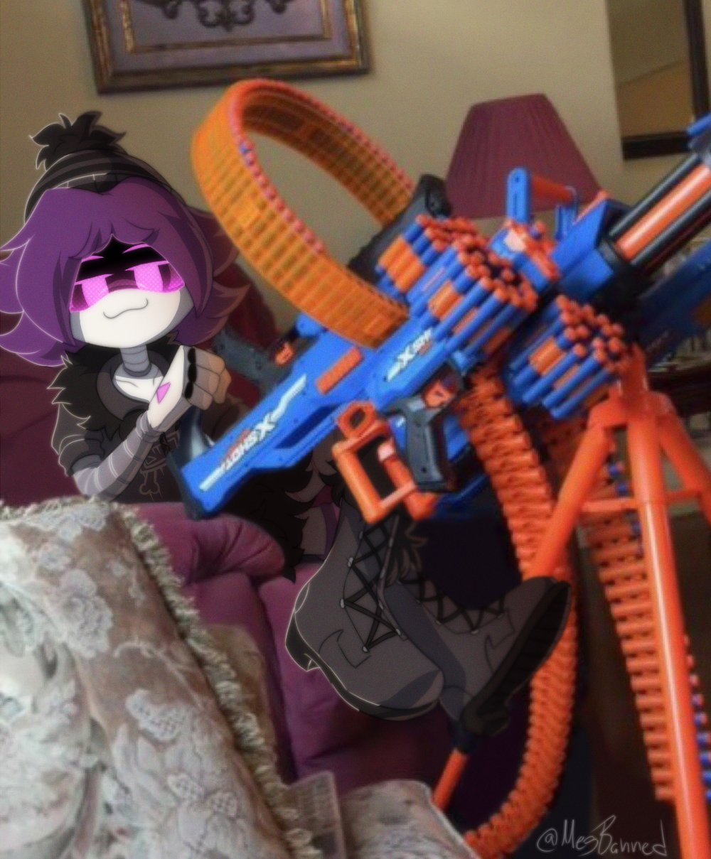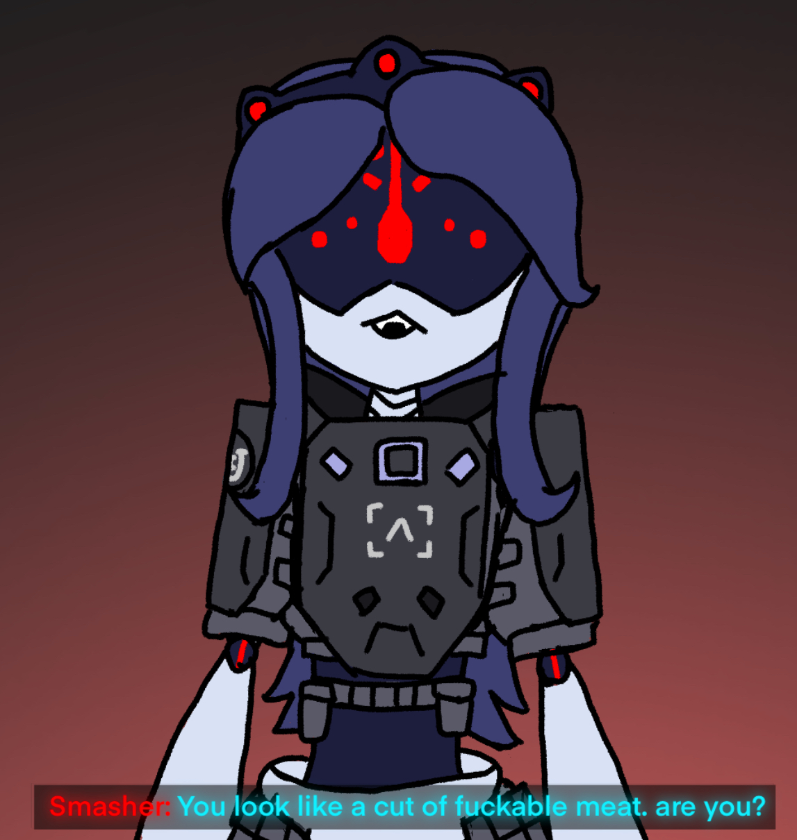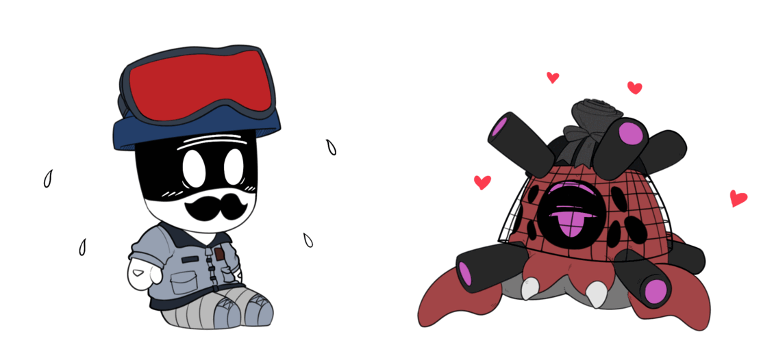 >"Y'know... I've noticed the way you've been looking at me lately." the enforcer begins. >"Huh, wha-?!" Masqys eyes widen as a subtle blush spreads across her visor. She didn't think he'd actually say something. >"You've been eyeing me up and down, haven't you, little lady?" his eyes seem different, they display an expression he's never worn. He looks smug, cocky, even... and aroused. >"I... uh... I-" she stumbles over her words. She's dreamed of this day, or, well, night, for so long... but now that it's here, she has no idea what to do. >"Be honest." he gets closer, "Do you like me?" >Masqy feels like she's been set ablaze. Her whole body is hot with either shame, or something else entirely. She wants to speak, but the words won't come out. >Masqy clears her throat, "...Y-yeah." >"How much?" he doesn't miss a beat, crawling even closer. Masqy's pushed onto her back as her partner intrudes on what little personal space she has. >She stares up at the large figure draped in shadows, quietly whimpering. >"I like you too." he says, leaning in close, as if he's about to kiss her with the mouth he doesn't have, "...A lot." >Jugg caresses the side of Masqy's fluffy bob, his hot breath fogging up her visor. >"And neither of us can sleep, so..." he plays with her hair, twirling around his finger. >Her breathing quickens, her mouth is left agape. Since when were those hands capable of anything other than violence?!