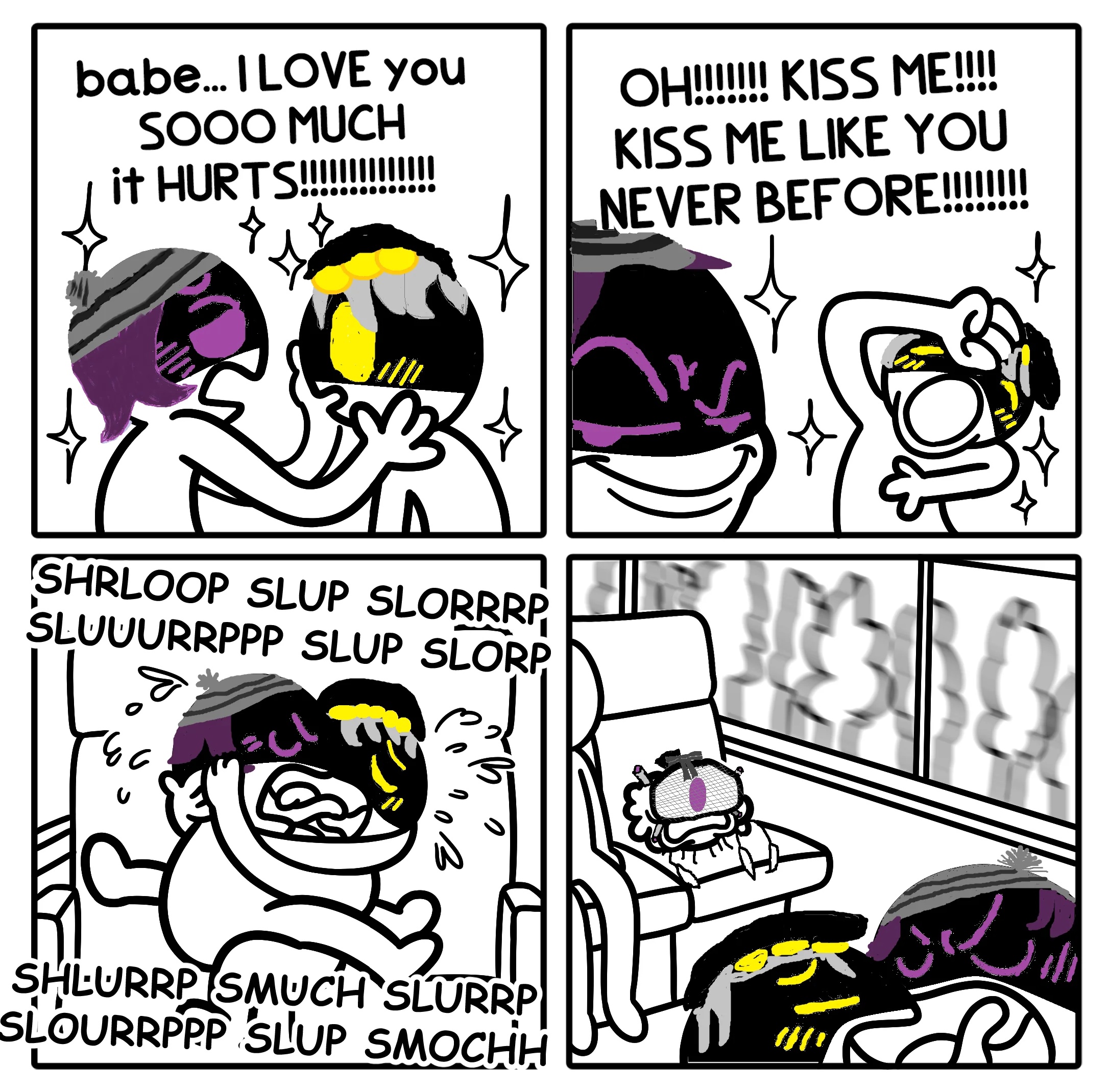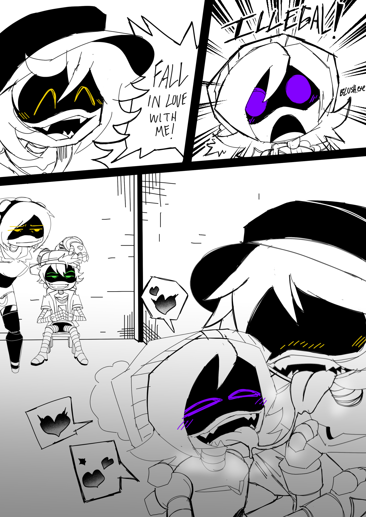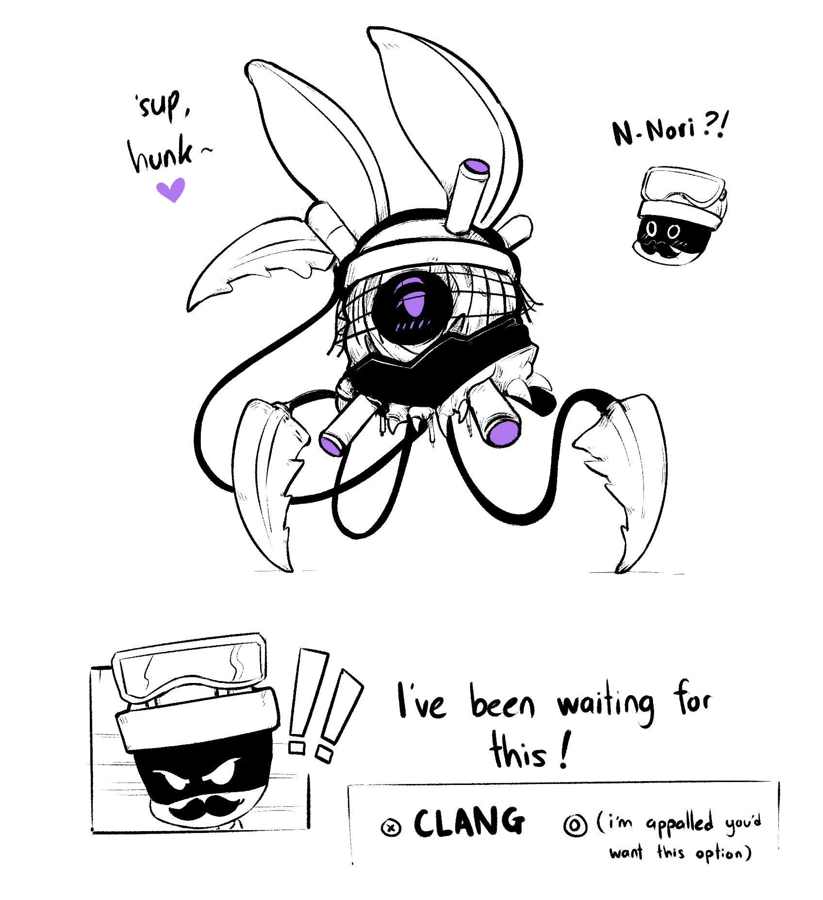 >"Y'know... I've noticed the way you've been looking at me lately." the enforcer begins. >"Huh, wha-?!" Masqys eyes widen as a subtle blush spreads across her visor. She didn't think he'd actually say something. >"You've been eyeing me up and down, haven't you, little lady?" his eyes seem different, they display an expression he's never worn. He looks smug, cocky, even... and aroused. >"I... uh... I-" she stumbles over her words. She's dreamed of this day, or, well, night, for so long... but now that it's here, she has no idea what to do. >"Be honest." he gets closer, "Do you like me?" >Masqy feels like she's been set ablaze. Her whole body is hot with either shame, or something else entirely. She wants to speak, but the words won't come out. >Masqy clears her throat, "...Y-yeah." >"How much?" he doesn't miss a beat, crawling even closer. Masqy's pushed onto her back as her partner intrudes on what little personal space she has. >She stares up at the large figure draped in shadows, quietly whimpering. >"I like you too." he says, leaning in close, as if he's about to kiss her with the mouth he doesn't have, "...A lot." >Jugg caresses the side of Masqy's fluffy bob, his hot breath fogging up her visor. >"And neither of us can sleep, so..." he plays with her hair, twirling around his finger. >Her breathing quickens, her mouth is left agape. Since when were those hands capable of anything other than violence?!