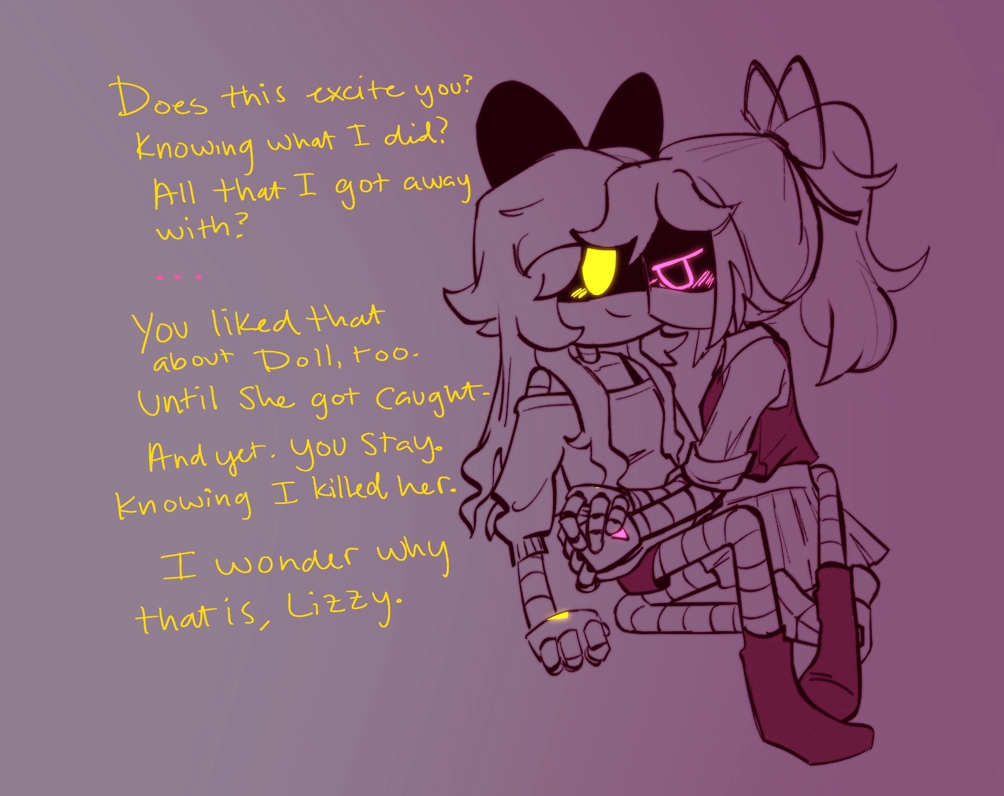 >realistically She's just a social enemy of Lizzy's. But Lizzy hyped her up as an "Überbitch" so much that the others feel obligated to hate her on principle. Uzi probably couldn't pick her out of a lineup if she tried and N only can because he treated her "lore" as a job. Probably did hit on Lizzy's dad though. Either that or the Russian thing.