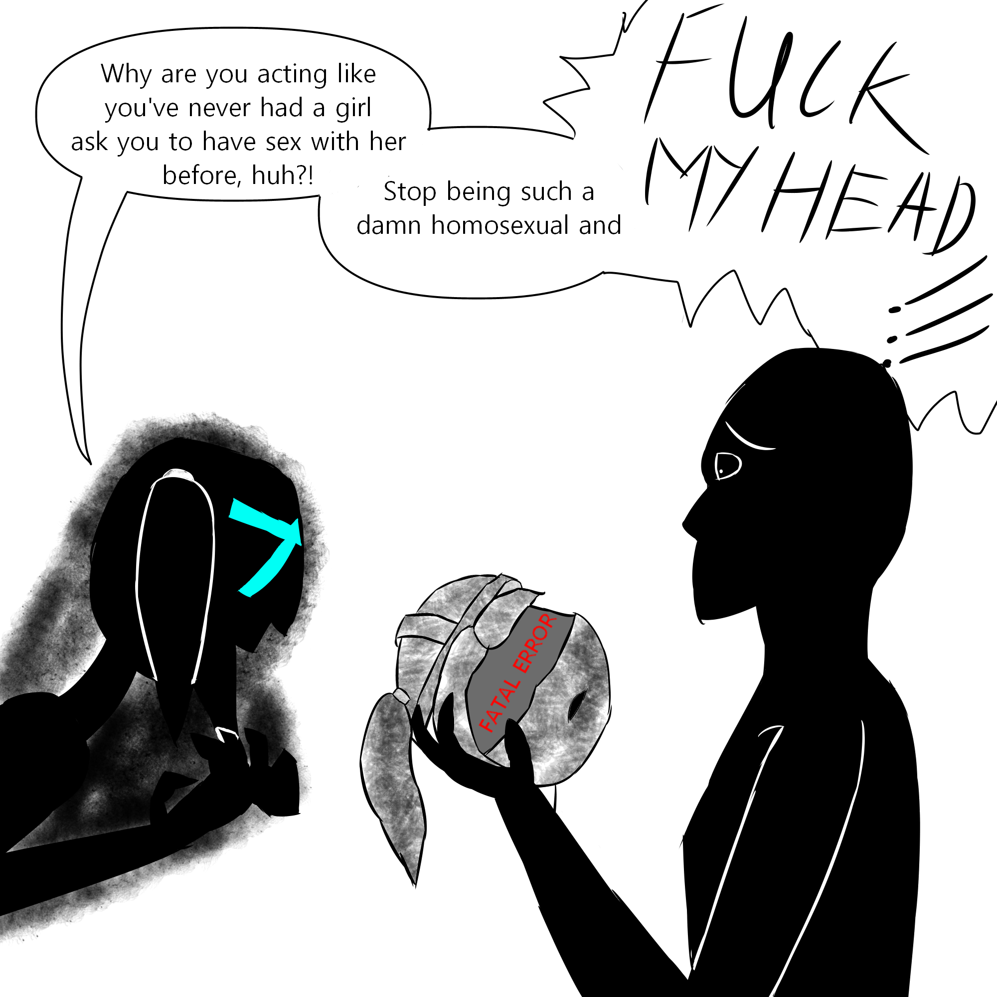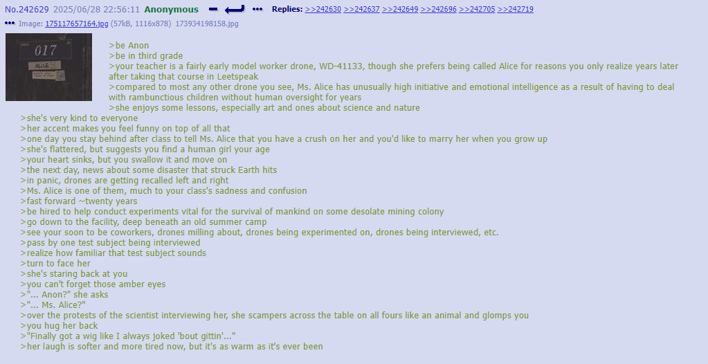 >Be me Anon. >I’m sitting with Emily in the library as she quietly reads a Christian book. >"So, Anon..." >"Since you arrived, you just been sitting quietly and just watched me read." >"Are you gonna read something? It's been... like a half an hour already." >"I mean-I, don't misunderstand, I love having you around and all..." >"But, well, um..." >"But this is a l-library." >"Do you want to read or just hangout?" >"Oh, so you really came for a book." >"So, what book are you looking for?" >"Something specific like holding hands with a drones tutorial or romance..." >"I don't know what came over me, forget what i said and robo-god please forgive me for my sinful thoughts." >... >"Anon? " >"You actually want a book on dating?!" >Emily blushed a little and smiled gently. >"Oh, sorry, it's just that... That was a little surprising coming from you for all people. " >"Let me check quickly... maybe over in this section... ?" >"Forgive me for asking Anon but..." >"With being the only human alive, why would you find drones attractive?" >... >"A drone too cute and special for you to ignore, you say...?" >"Wow, Anon... That's amazing news!" >"Well, I'm glad you finally found some drones to love." >"You know I've always prayed to robo-god for you to be happy..." >"May I know the name of the lucky one? " >You refuse to give their name but you said they have a special blue hair. >"Oh Rebecca...?" >"W-Well, she sure is a pretty cute, it's just... " >"Nothing! I mean... I have to go." >"H-Here's your b-book, Anon!" >"It's l-late already and as a good drone. I should be heading home sooner than later" >"THANKS, BYE!" >Before Anon try explaining himself that he was talking about her, Emily rushed to the exit. >He noticed what it look like...tears on her visor? >"AAAAHH" >"I'M SO STUPID!" >"WHY WOULD THE MOST WONDERFUL BEING AND ROBO-GOD GIFT ITSELF EVEN NOTICE ME?" >"I'M JUST..." >"I'm... Just... the final girl." >"The only one left after all options has been exhausted."