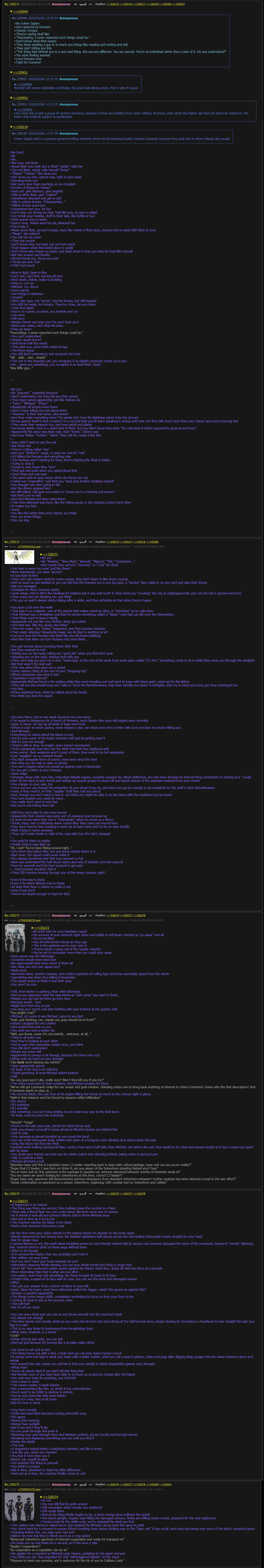 >>348132 >J, ball of trauma >3 clone Js that seem to be caricatures of her >And this guy. >He's smarter and more capable than N, at least... >Together, they... attempt to corpo-speak their way around the fact that, with no orders coming in and nothing to do, they're just kind of wasting time doing whatever comes to mind