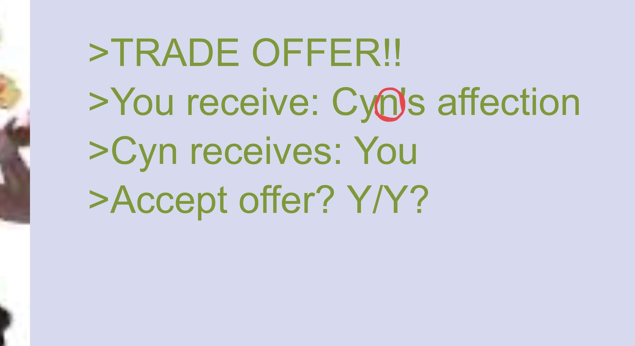 Friendly reminder that Cyn doesn't actually love you and she's merely a puppet of the Absolute Solver,. aimed to take advantage of your emotions. Never believe her when she says she "loves you". In her eyes, you're just another meal.
