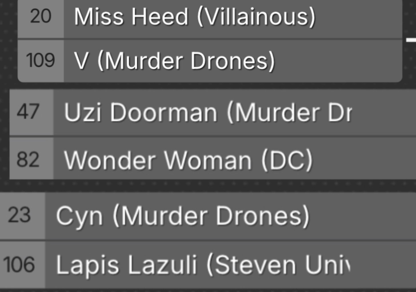 >>41610 >>41616 >>41626 Remember, there is no fair play with these tournaments. Everyone's out to get their waifus to the top. Botting, spitevoting, organized efforts, multiple alt accounts in the case of having to use Gmail like this year. I wasn't expecting Murder Drones to get far, round 1 was good enough (Uzi was up against Wonder Woman, a major character in DC Comics. Cyn was up against Lapis, you should know SUG is still around. V was up against Miss Heed from Villainous and she's much more popular). Besides, these tourneys garner some of the nuttier anons and I'm glad to be knocked out early so they don't render Murder Drones threads unusable. I'm expecting the /co/ prime thread to be flooded for a while so I'm more inclined to stay here but it is what it is. Hopefully some of the anons there are more willing to try plus if that happens. >>41617 Lapis. She has fans and you have to remember SUG still exists. >>41624 Just do it for fun.
