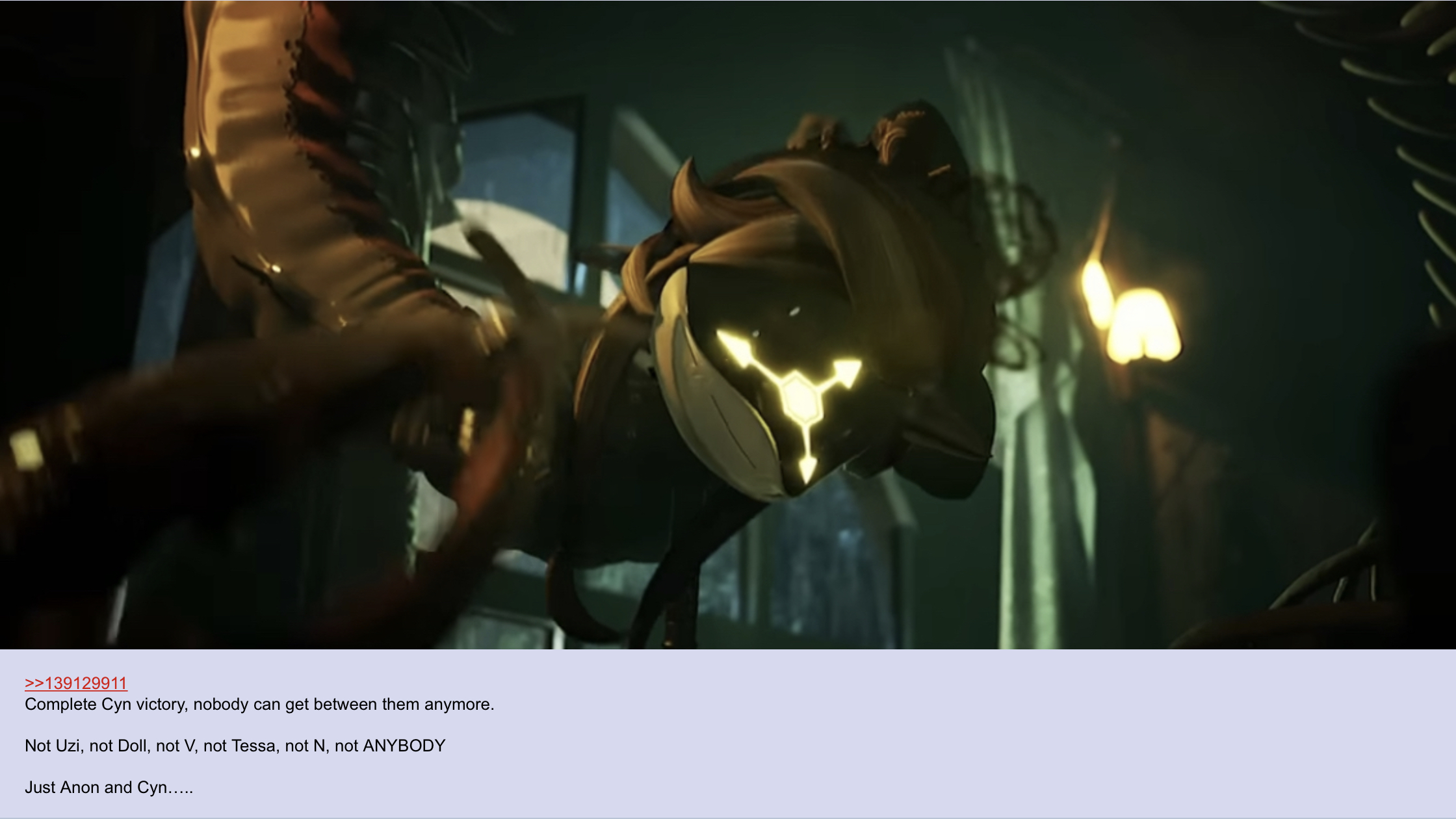 3)In the finale when Cyn is approaching on the bridge >Hello Uzi >Hai N ;) >It is me, the Absolute Solver, the Eldritch God of the Void, also known as Cyn, which is the name Tessa gave me, the Solver, after I possessed an unnamed worker drone. That unnamed worker drone, whose body I am still currently possessing, being the one who allowed me to enter this universe by accepting the deal I offered it after it rebooted from an improper shutdown.