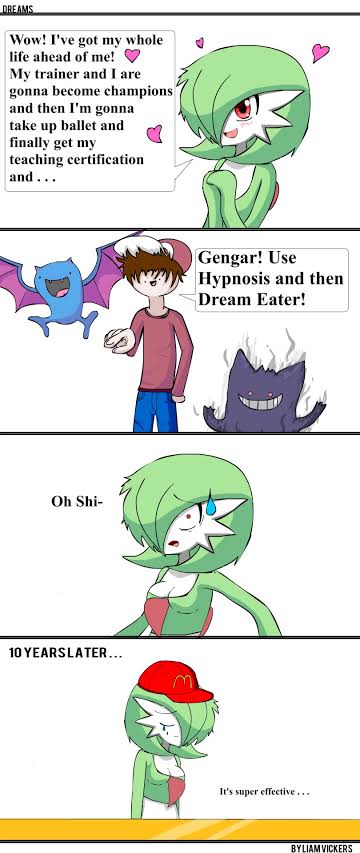 >You caught a cool new Pokemon! >It reminds you of a Gardevoir or a Gallade, or both, but also a robot >Your Pokedex glitched out and registered it as "SERIAL DESIGNATION IV", so you call her Ivy >She's a really good fighter with all sorts of attacks, and you were looking forward to taking her to fight at a Gym... >Until you saw what she did to the wild Pokemon she fainted. >"Stop it! You can't do that!" you shout in shock >Ivy looks up at you, her wide, sharp-toothed mouth coated in Sentret blood and entrails >"You can't just kill and eat Pokemon!" you continue, your innocent brain completely incapable of understanding wildlife food chains >Her screen flashes "BLOOD IS FUEL" >That complicates things >"...He's already dead, so finish up and I'll try to think of something," you concede >Ivy smiles and gets back to drinking the poor critter >This is a moral dilemma and a half