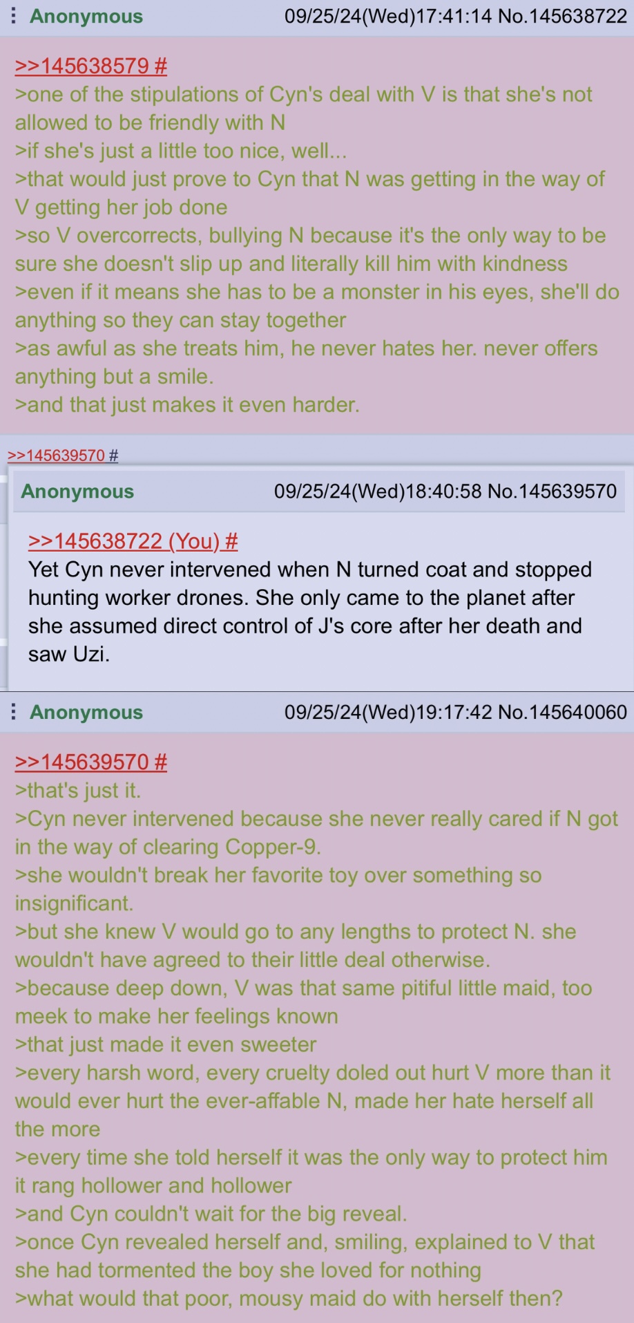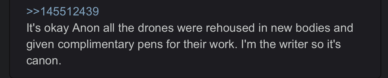 Also much love to the Anons fighting over such greentexts. And the happy endings are as canon as you want them to be I am a proponent of death of the author.