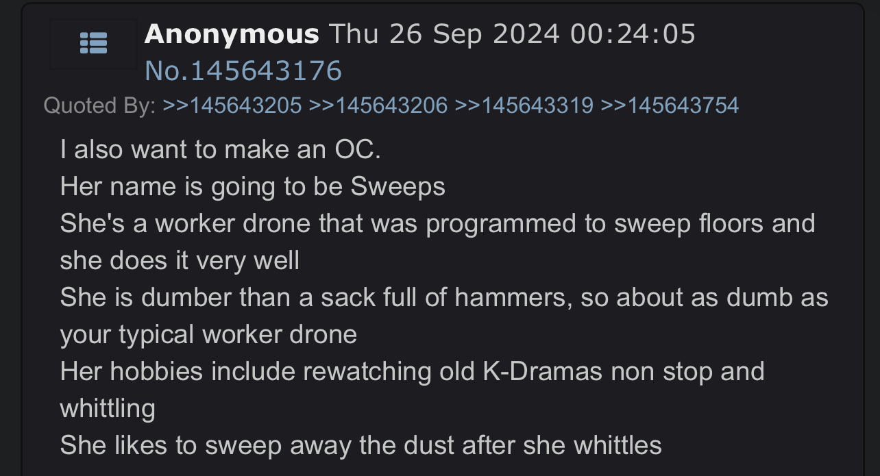>>49698 The way I see it there is a minimum level of autism to post here. Everyone here is equally as obsessed with drones as I am, and many people here have made OC characters. So being around so many like-minded people gave me the confidence to post a long poorly written greentext and a bunch of shitty art about my own OC. Also Smilaanon is very encouraging. It honestly sounds like you just got unlucky when posting on /co/ because I don't think I've ever really had people shit on me.