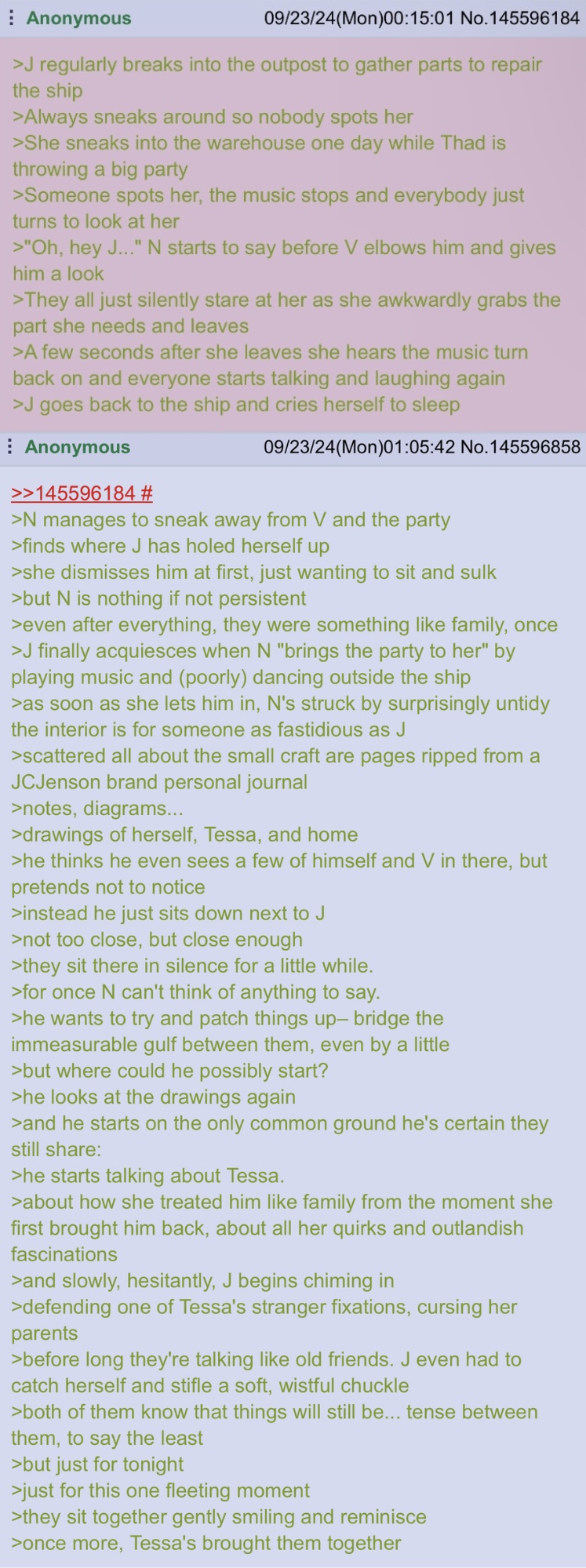 So I actually have a bit of a question I'd like to ask regarding the capping & cataloguing of greentexts created with prompts from the OC Wheel... Is there any particular way (You) would like to see these particular greens capped? So far I've narrowed it down to a few options but I'd absolutely love to hear other suggestions/gauge a rough consensus before proceeding. >Everything replying to a particular 'anchor post' (IE the original prompt) gets put into a singular shared cap >Everything individual greentext gets a cap >A mixture of both options (IE individual caps linked together by a pool/collection on the booru)