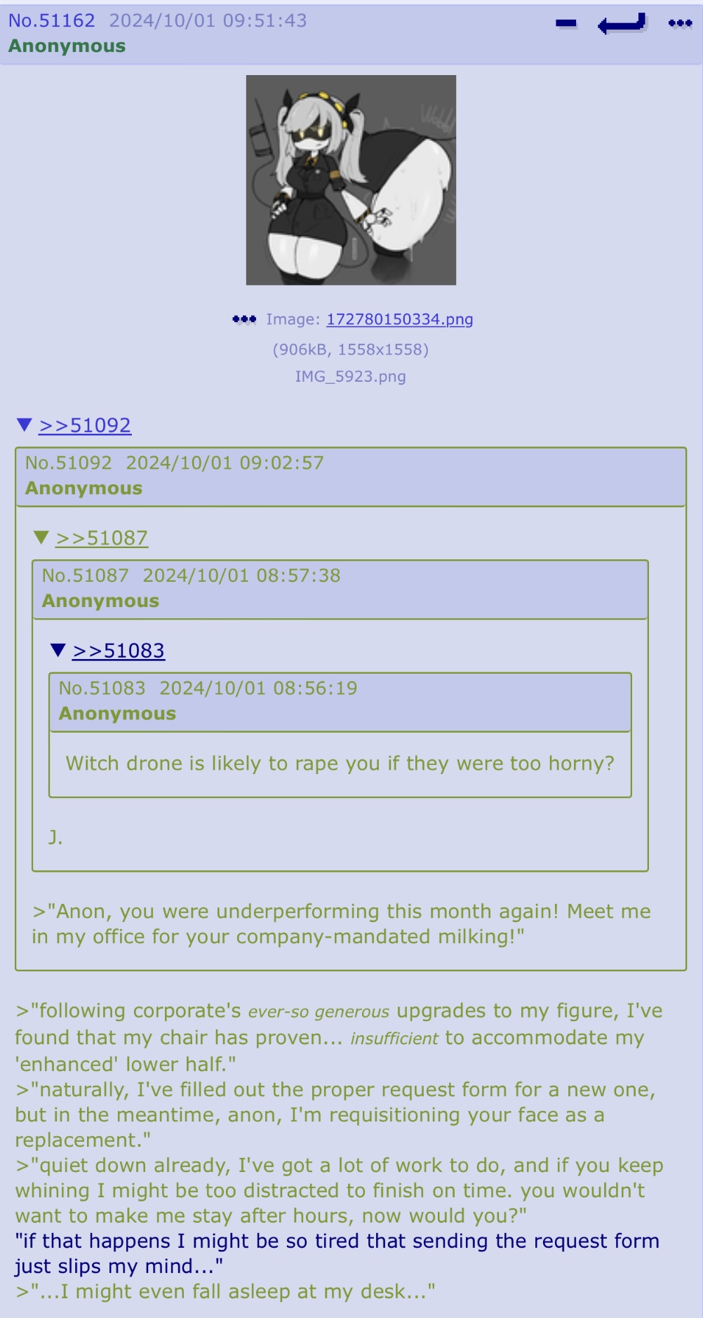 >>53253 To be fair, I had good reason to suspect you considering you kinda advocated for it; but also what are you talking about? There's always been some kind of fetish in the threads, bloodplay, wireplay, etc... I don't see how the giant Drone greens are necessarily any different. Although I'll admit the SD-U-U ones ending surprised me