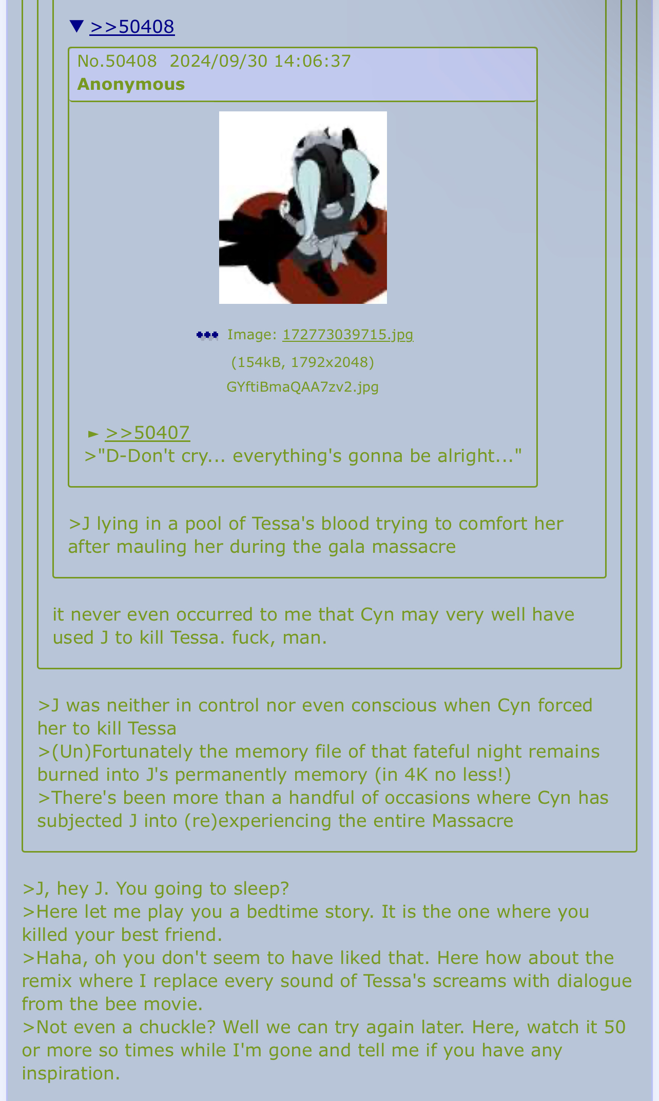 >>53631 >be average NEET girl named [redacted] >weird purple rat thing enters home >meh idc >they ask for favors, do em cause why not >this starts a cult. You give a rat a cookie and they start sacrificing Enns to appease you. >not ideal but it’s too far on now to do anything about it >their belief in your horrible dark god has begun to change you in minor ways, nothing serious but your hair moves on its own and you seem to be able to do things to the Oogis and just them >one day an oogi tried usurping you, questioning your strength and godliness as it’s sub hive within the hive has recently fallen. No true god would allow this >It eeps and stabs you with a toothpick, you minorly annoyed tell it to piss off. It literally turns to piss and falls on the floor in a disgusting puddle >concerning. But no more stabbing >this is not ideal and you don’t know what to do. Your computer is now barely working and sometimes a message will come up from “ABS_SOLVER” telling you to “Go fuck yourself” or “Let me in to kick your fucking ass” >when playing multiplayer games you will sometimes be invaded by a girl named “Abblejuicelover314” who uses some kind of cheat software and ruins the game >you probably shouldn’t have gave that purple thing a cookie