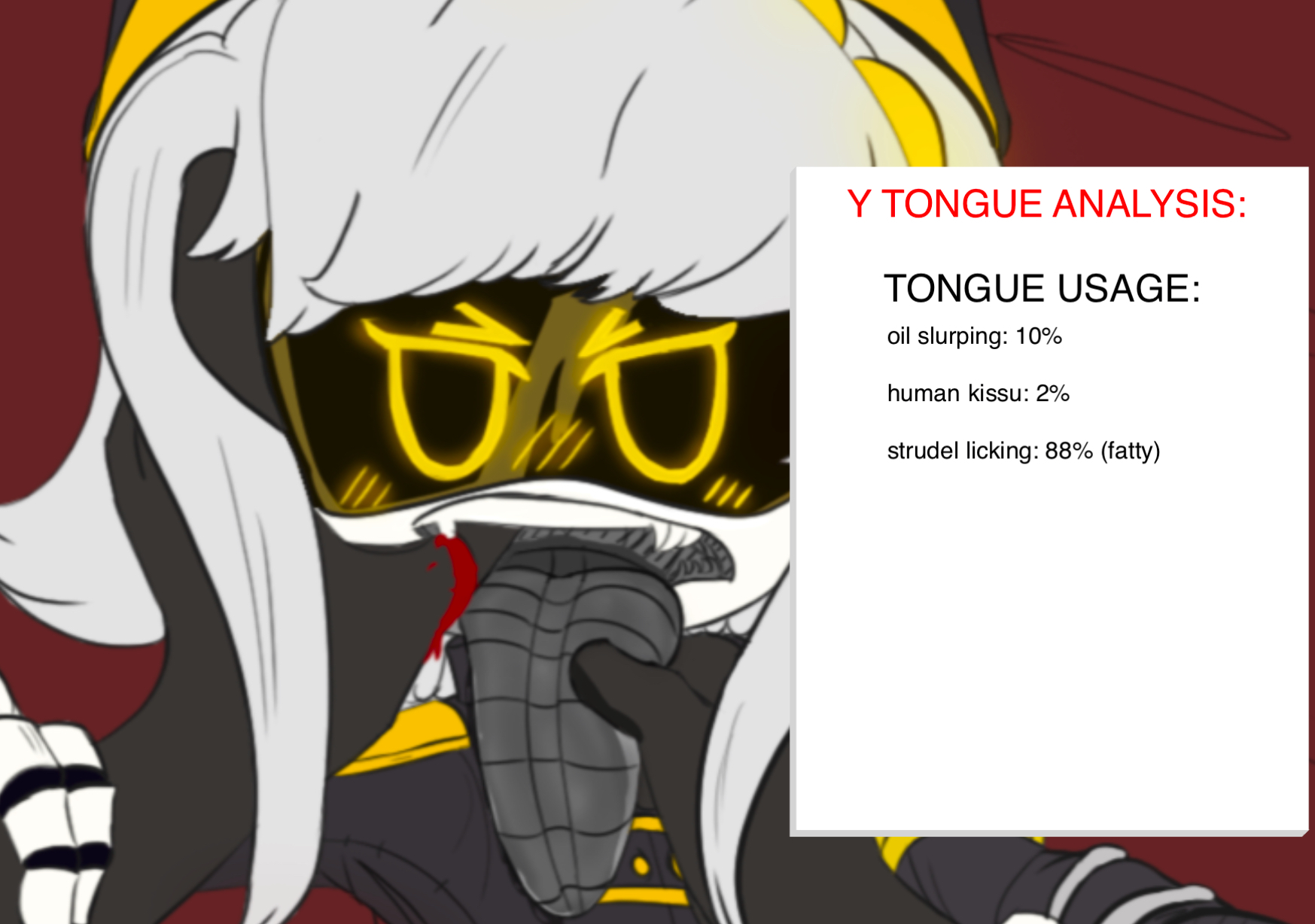 >>53853 >pull on Y's tongue >keep pulling on it >she initially tries to bite you but stops when she realizes you're still going >like a clown pulling lengths of bedsheet from his mouth, Y's tongue just keeps coming and coming and coming >"Zhat ish enoufsh" she tries to say, hampered by the several feet of slippery drone tongue you've pulled out of her