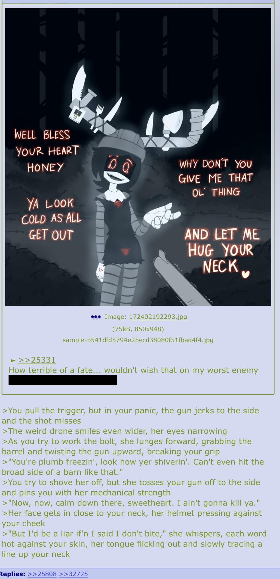 >>53579 >The shape was distinctly feminine, from the oversized bow in its hair to the sashay of its hips beneath the dress >it's form, save for those glowing eyes, blended into the darkness of your room as you stared at it from your bed >You tried to move, but something held you in place >Not fear, though that definitely was a close runner-up, but something more tangible. >The thing shambled closer, and raised a hand >You briefly saw something flicker between its fingers before your phone came to life >A post on your favorite Brazilian Eyebrow-waxing Editorial Page >In a thread you had almost single-handedly kept alive for a day >The subject: monster girls and why they're great >Looking from your phone, back to the shambling thing and its steadily growing smile, you think you got the message >The message: that IT got YOUR message, and it liked what it read >The thread, borne of the desire to substitute the warmth of friendship for the heat of a flamewar, had ended in comradery between you and the passing through posters >But it was still relatively fleeting, an escape >This thing, steadily moving towards your prone body with all the eagerness of a Sunday stroll, had seen your post as some kind of call >And answered eagerly >As it reached the foot of your bed, you found the vestiges of your voice, and asked it what it wanted >The smile never left its face, but the expression looked as if you had asked the dumbest question in the world >It -She- what you to know that you were loved >She LOVES you >You only blinked, but it moved at such a speed that you felt the wind knocked out of you from the impact >It cleared the remaining distance in an instant >You screamed >You felt something against your lips >Your vision became hazy as you looked into that smile that never left its face >What happened next, you still can't remember >Shapes and sensations you had never before felt >Hands, DOZENS of hands, feeling you from all angles >An indescribable heat, like a furnace hidden under a thin layer of cloth >An unending parade of tongues against your skin >The feeling of your body being ripped apart and put back together >The alien sensation of tendrils worming through your brain >The absolute violation of your very being in a way that felt perversely intimate >The paradoxical love behind every action >The realization that you were terrified for your life, but didn't want it to end >You were out for a while >how long is anyone's guess, but the morning light came through your curtains >You thought it was a dream, maybe a nightmare >But you knew one thing for sure >SOMEONE was in your kitchen, and from smell of things, breakfast was ready