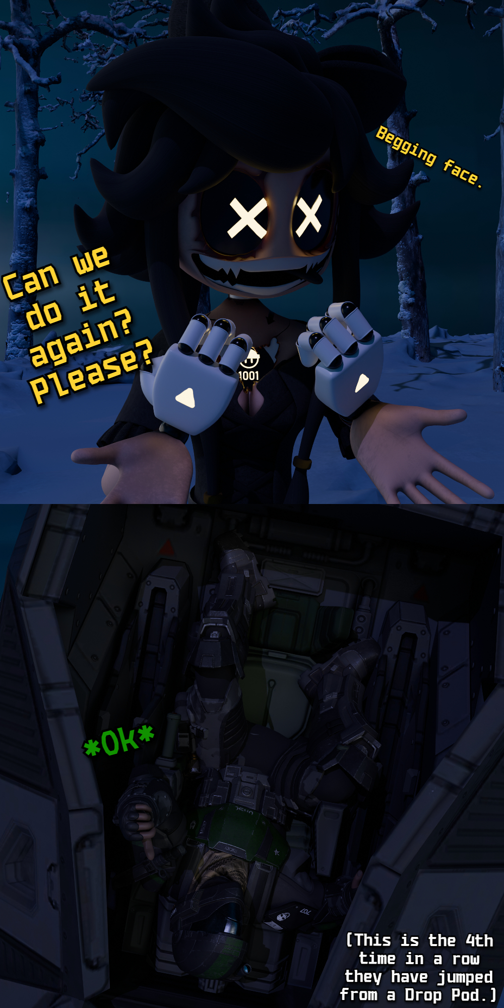 >As a reward for defeating the Solver, the drones are reborn as eldritch entities in a new,undestroyed universe >They come across a squishy mortal >Its Tessa, the real, unskinned version What are their reactions?