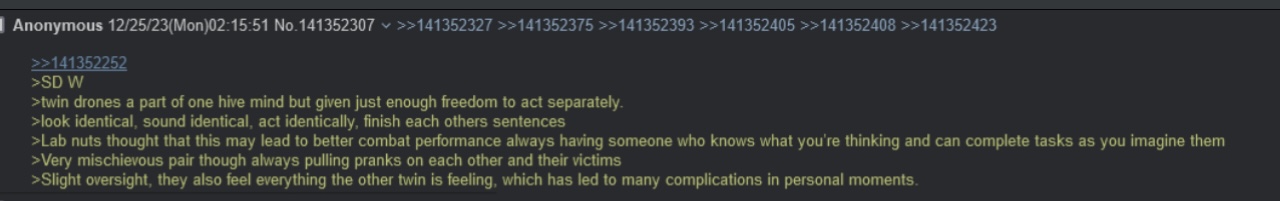 >>60498 >>60504 >>60522 >>60524 Oh that’s sad. Like, really sad. I will now give a funny idea as coping >Uzi and N are done killing people, but the hunger persists >Decide to engineer a way. That being to absorb a Drone’s consciousness and spit it out in a new body when she’s done feeding. >Like what the Solver did with N, J, and V but not as malicious