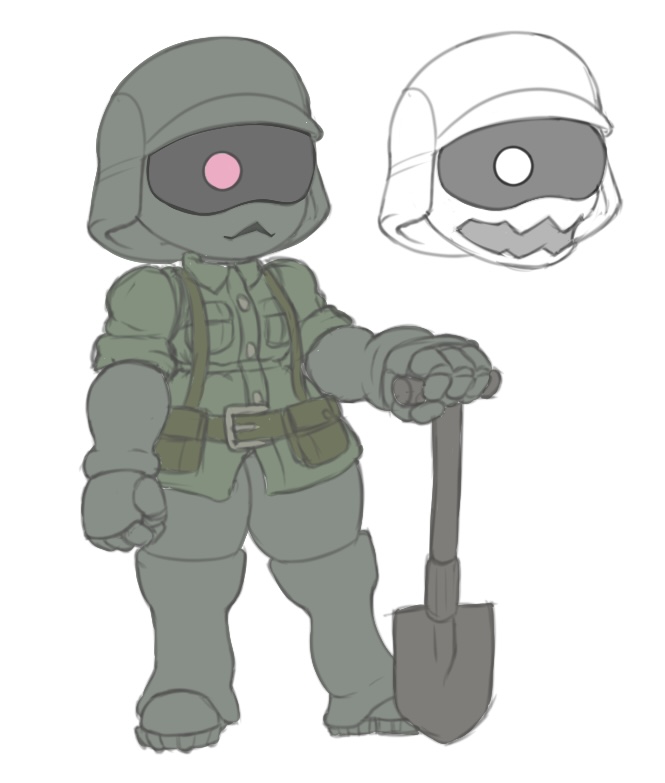 kicking around the idea of a mass-produced military grunt drone. this is the design I've got so far, but I'm not quite happy with the uniform. open to ideas and suggestions. >human features were deemed a needless expense, so all grunt units are fitted with a basic monocular optic system and a non-emotive faceplate >speech capability, though initially considered for exclusion, was deemed necessary for proper communication with other personnel >audio quality only needed to be acceptable. as such, grunts only possess low-end vocal synthesis hardware >human squadmates have described grunts' voices as sounding like they were coming out of an old walkie talkie
