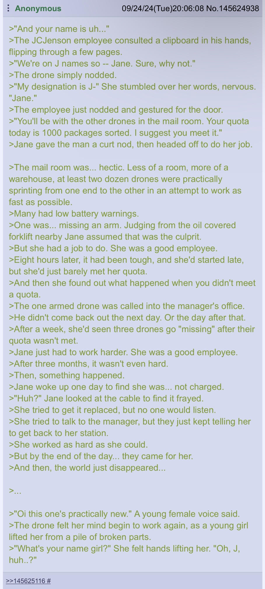 >>60350 >Once night came, the six helpless cores continued their journey. >The spire now loomed in the distance, its towering form cut into the night sky. >As they drew closer, tension and anticipation filled the cores. >The silence between them was only broken by the occasional scraping of their appendages against the terrain. >“We’re close,” Navi said, her voice was low. >It had been days of crawling, scavenging, and clinging to the slivers of hope. >Now, the structure they sought was within reach. >They approached the base of the spire, a towering structure consisting of drone corpses. >This was where J had sent the message, and from here, they hoped to finally get some answers. >William, despite his usual calm, hesitated for a moment before they entered entrance at the spire's base. >“What if she doesn’t want to help?” he asked. His voice was uncertain. >Navi turned to him, her single core-eye's gaze was unwavering. “We won’t know until we try.” >They crawled into the dark entrance of the spire and their cores glowed faintly in the dim interior. >Inside the spire, they immediately came upon a wide chamber, and there, standing before a ship wreckage, was J. >Her sleek form was imposing, even with her back turned to them, she commanded presence. >She was clearly working on the ship, and welding tools from what's supposed to be her hands drew sparks in the metal surface of the ship. >“J!” Navi called out, her voice cut through the stillness. >J paused, her metallic shoulders stiffened at the sound of their approach. >Slowly, she turned to face them, and the glowing eyes on her visor narrowed as she took in the sight of the six cores crawling toward her. >“13F, 15M, 41F, 22M, 39M, and 6F?” she muttered while the distaste was clear in her voice. >“I was wondering when you’d stop spamming the network.”, she didn’t seem the least bit pleased to see them. >Her eyes flicked over each of them and said, "We always assumed your teams were terminated", and J scanned over them them as though they were useless equipment. >“We need your help,” Navi said as she stepped forward. >“Our self-repair isn’t functioning, and we can’t reach the-” >J raised a hand, and she cut her off. “Self-repair failure?” she asked. >J's voice was thick with sarcasm, “Sounds like a personal performance issue to me. Did you file a maintenance report? Submit your request to the appropriate channels, and maybe you’ll get a response in, I don’t know, a few solar cycles.” >With J's words dripped with disdain, she turned back to working on the ship, as though their presence was an inconvenience at best. >“Miss J,” Cynthia said, her voice was softer, more pleading. >“We’ve been trying to reach the mother. She’s… she’s still here, isn’t she?” >J’s stopped once again, her movements froze for just a moment, then, she let out a dismissive huff. >“Mother? You mean the Boss?” she repeated. >“Oh, she’s technically still around, if that’s what you’re asking. But let’s just say she’s 'unavailable' for any one-on-one consultations at the moment.” >“Unavailable?” Alya pressed. Her frustration was growing, and she followed it with another question of “Where?” >J sighed dramatically, and turned around to face them again. >“Look,” she began, “I don’t have time for an HR Q&A session with rank-and-files like you.” >“The Boss is somewhere out there. Dealing with whatever it is that falls under her very busy, high-priority schedule. Not my problem, and certainly not yours.” >Andro, who had been quietly observing, took a step forward, “We just need to know what happened to her,” he said. >His voice was calm but resolute, and he added “We’re malfunctioning—" >J scoffed as she folded her arms, “Malfunctioning?” she once again repeated. >“You’re lucky you’re still operational.” >“If I had to sign off on your performance reviews, you’d all be terminated for gross inefficiency.” >“You’ve been crawling around like this for how long?” >“And you think I’m going to waste time fixing your issues?” >Every sentence was carefully designed to belittle their efforts. >Navi stepped forward again, with a firm voice, “We’re just trying to understand the situation as lowly rank-and-files”. >“Surely, Supervisor J, as our superior, you should understand that.” >That seemed to catch J’s attention as her eyes slightly flickered. >For a moment, she regarded Navi with something almost akin to respect. >“Supervisor J, huh?” she said. >“Well, I suppose I am technically your superior in the chain of command…” >She trailed off, clearly pleased by the title. >There was a brief pause as she considered them. >Though her expression didn’t soften, there was a subtle shift in her stance. >“Fine” J said, her tone was slightly less harsh. >“I’ll give you this: the Boss is in the Worker Drone settlement, but don’t get your hopes up.” >“She’s, let’s say, preoccupied with other matters.” >“So if you’re expecting a warm welcome and a problem-solving session, I’d suggest realigning your expectations.” >Having received an answer to their question, William decided to inquire further and asked, “What are you working on here?” >J’s eyes then narrowed and said, “That’s classified, rank-and-file.” her tone was sharp again. >J turned away from them, and her hands flew back to working on the ship once more. >“That’s above your clearance level”, J further added. >“Now, unless you’ve got something actually useful to contribute, I suggest you return to whatever menial task you’ve been failing at and leave me to my work.” >The six cores stood there, stunned, and were unsure how to respond to J’s cold dismissal. >The faint glimmer of hope they’d carried began to flicker once again. >The six helpless drones then left the spire in order to locate a place for them to re