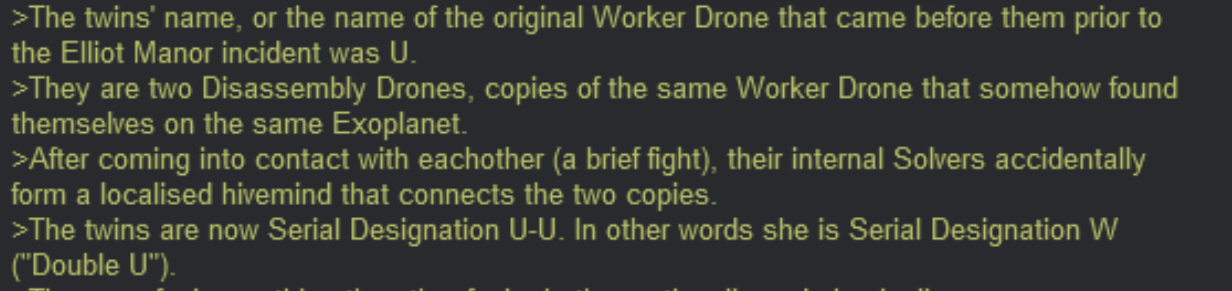 >Worker Drones need to be dismantled correctly else the whole world is doomed (Episode 5) >Worker Drones need to be manufactured correctly else the whole world is doomed (Training Video) >Worker Drones' personalities are the only thing preventing them from attaining god-like intelligence (Liam) >Worker Drones are made to self destruct in case their code is tampered with (Episodes 1 and 6) (The self destruction part could be the piece Uzi uses for her railgun) >JCJenson is aware of the Singularity Event long before the existence of Cyn (Branded Pen Merch)