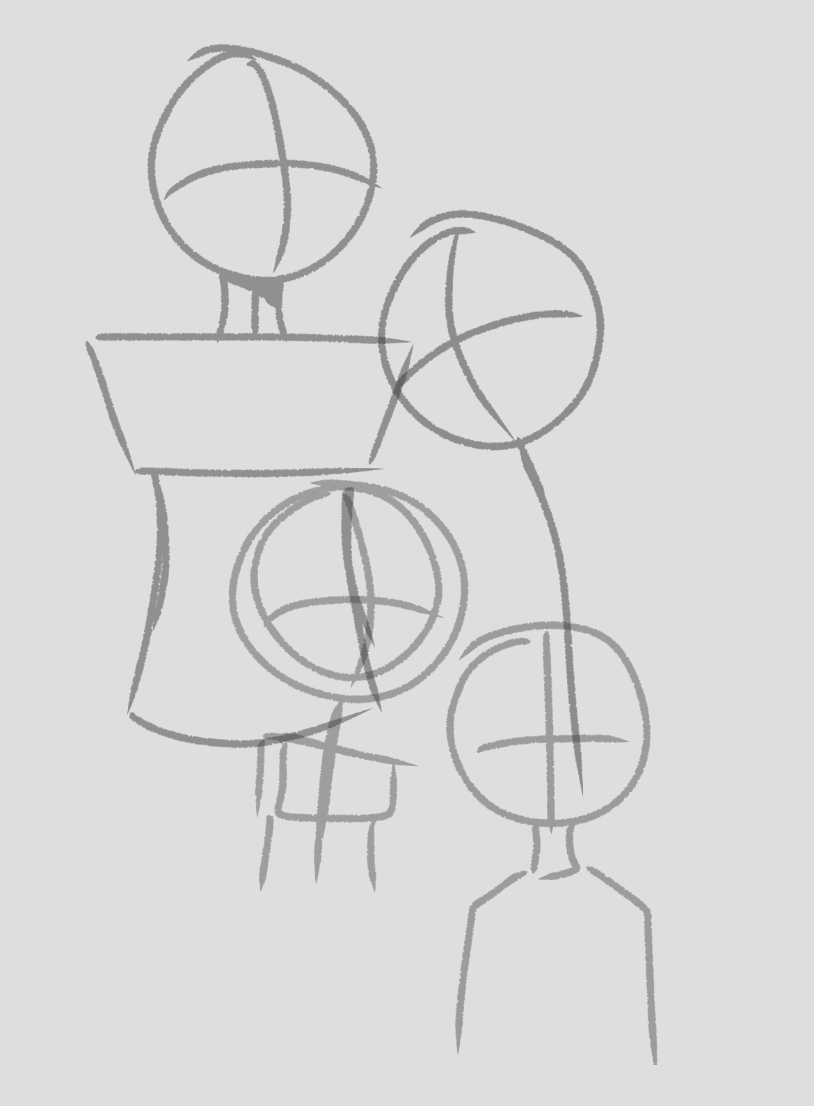 >>64797 >Proportions are never 100% canon if you don't put 20 hours in a piece The head-scaling technique works very well, and quickly. Drone bodies tend to be 2-3 head lengths tall, so get three marks down in the right places, some lines for proper width, and the head, torso, and limbs will come by decently fast. >>64759 For graph paper, making the head's height exactly some number of cells makes laying out proportions for the rest of the body very simple, with the rest of it then being counting cells or using a measuring tool. It seems that you're already doing that, so good job. As they're standing straight, and staring straight at the cameras, the shirt, clavicle, and midlines of the neck endpoints/head/visor/helmet should be aligned.