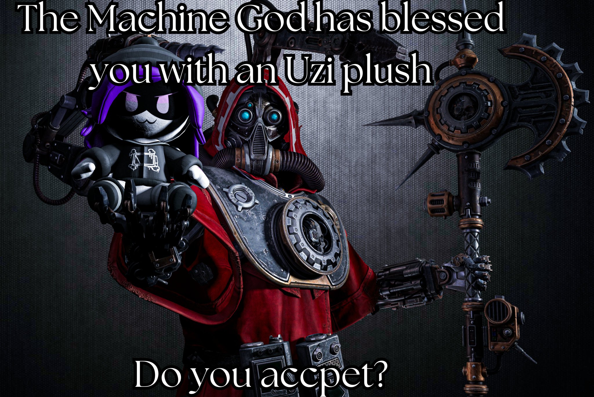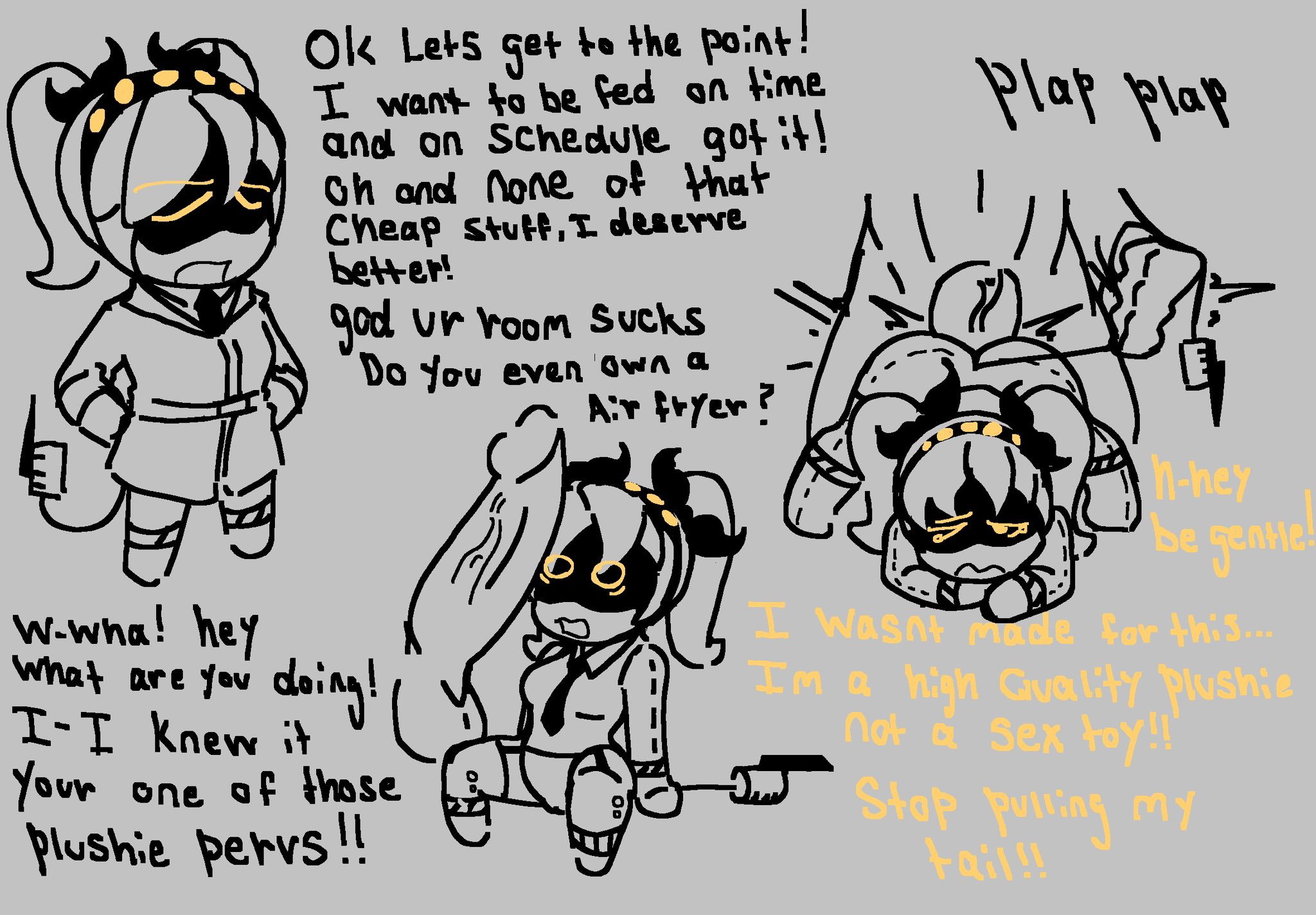>>66101 >uzi is replaced with a plushie >uzi was tired and decided not to show up for anything >she instead sent a plush with built-in speaker that played "bite me" or "idiot" at random intervals to take her place in the plot >somehow, nobody notices the difference >alice is particularly perplexed when the magnet won't stay on the plush's head, as well as when the sentinels ignore it entirely >the tape recorder's batteries go dead around episode 5's end, so it's just totally silent through all of episode 6 >even Liam is confused - they never rendered an uzi plush model >how the heck did it get in there?