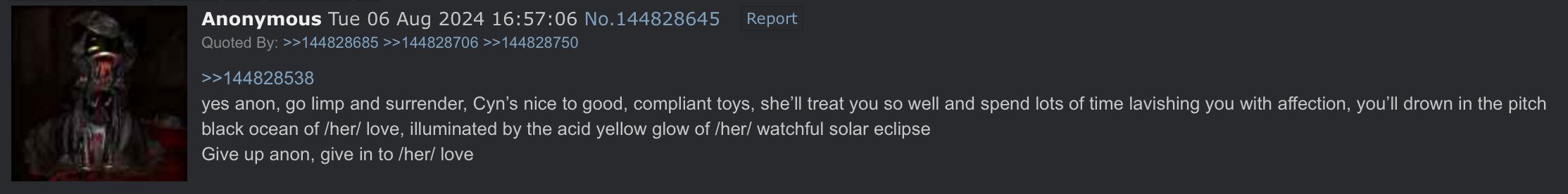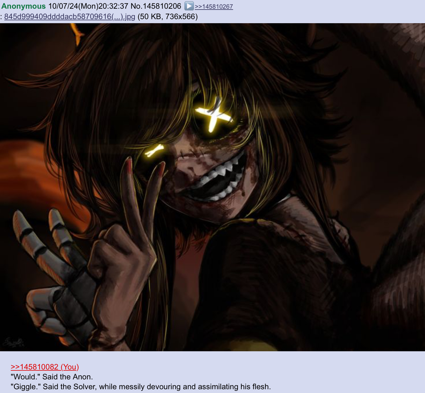 What was the culture of anons like? We here, for example, can quite arbitrarily start wishing each other well, hugging, and even offering kisses. It's all in jest, of course, but it shows that we're all very attached to each other. What kind of OCs have anons created? Almost all of our OCs have psychological illnesses or mental problems, because the MD world setting implies horror in the truest sense of the word.