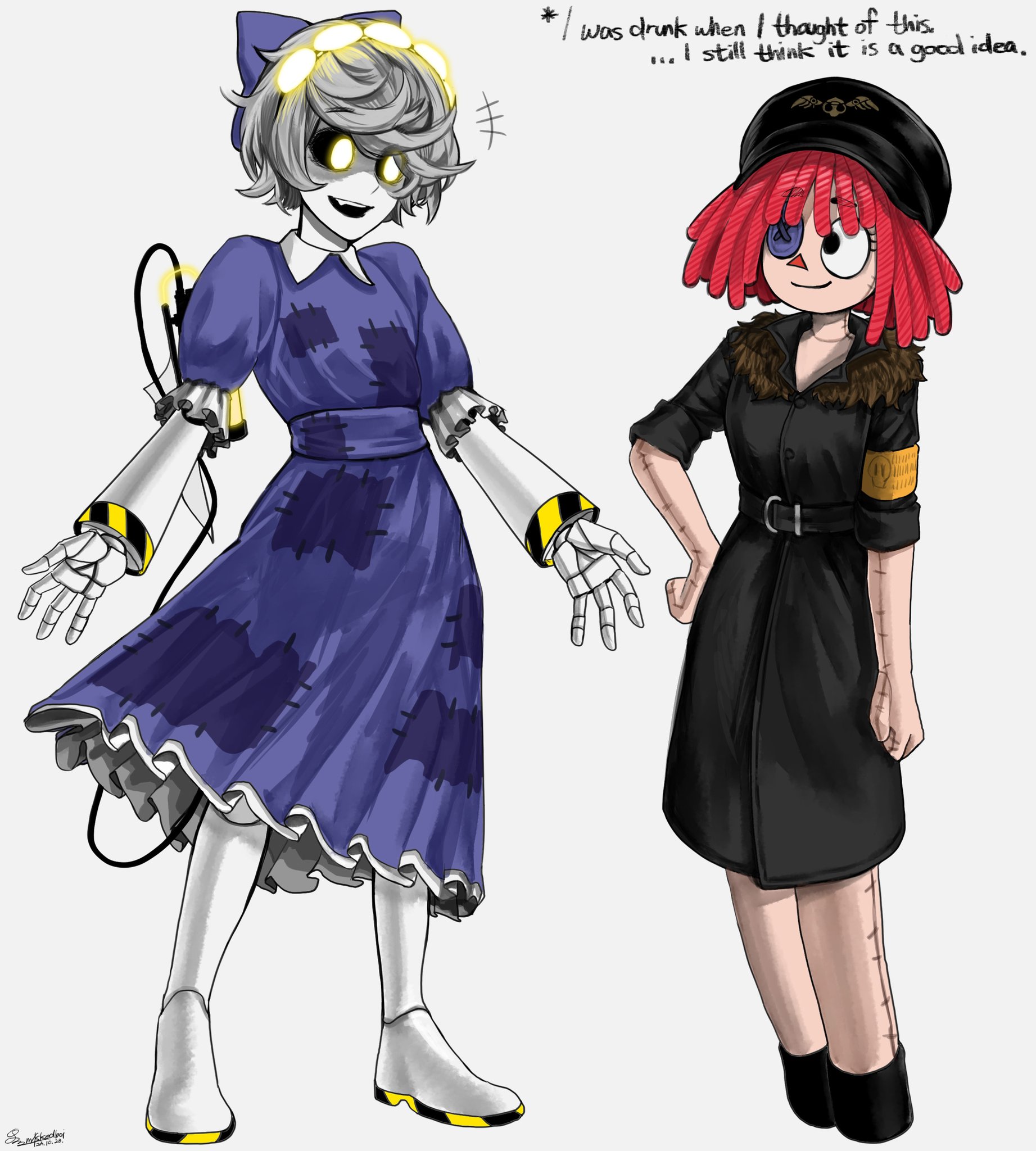 >>68710 >some fuckery occurred that allowed the gang to defeat the Solver by pulling Cyn and Tessa from its vore demon Pain Dimension and put them back in control of their bodies >their fused bodies >fast forward to Now >Cyn is a normal (but now horrifically traumatized) Solver witch again >Tessa, in addition to the shit Cyn went through, has to adjust to being a Michael Afton-style mess after the drones reassembled her body as best as they could considering what they had to work with