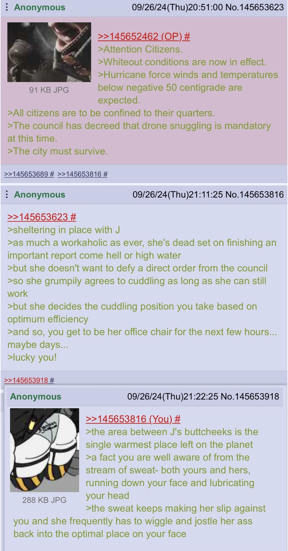 >Working with Giantessa >You are both posted at a remote location in an arctic biome >The two of you had to take your gloves off because you had to work on a delicate device or because they got wet and now your fingers are in danger of frostbite >Giantessa pulls her zipper down >You are to graze her giantatas with your hands so you can put them in her warm armpits >Naturally, you hesitate >Not because you are a gentleman but because this is a potential HR issue >"Come on then. You remember the instructional video. Shove 'em or lose 'em" she encourages you >You decide to do it. You might as well have a finger to flip at the HR people >Now it's her turn >She puts her hands in your armpits without hesitation >Or satisfaction >"Hmm." >"What is it?" >"Too small." >True. Her fingers are sticking out >Giantessa undoes your belt >"Hey! What are you doing?!" >She shoves her hands between your legs >This is your very private space! >And her hands are cold! >You go "Eep! Eep Eep!" like the mini drones kids like to torment >Giantessa laughs