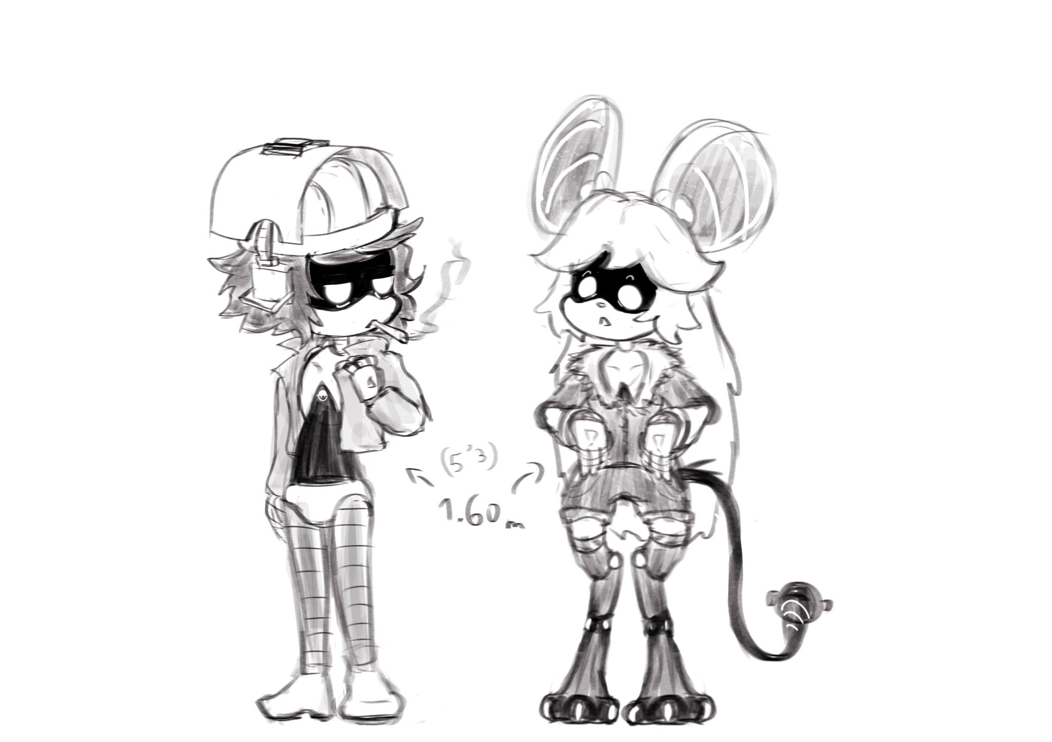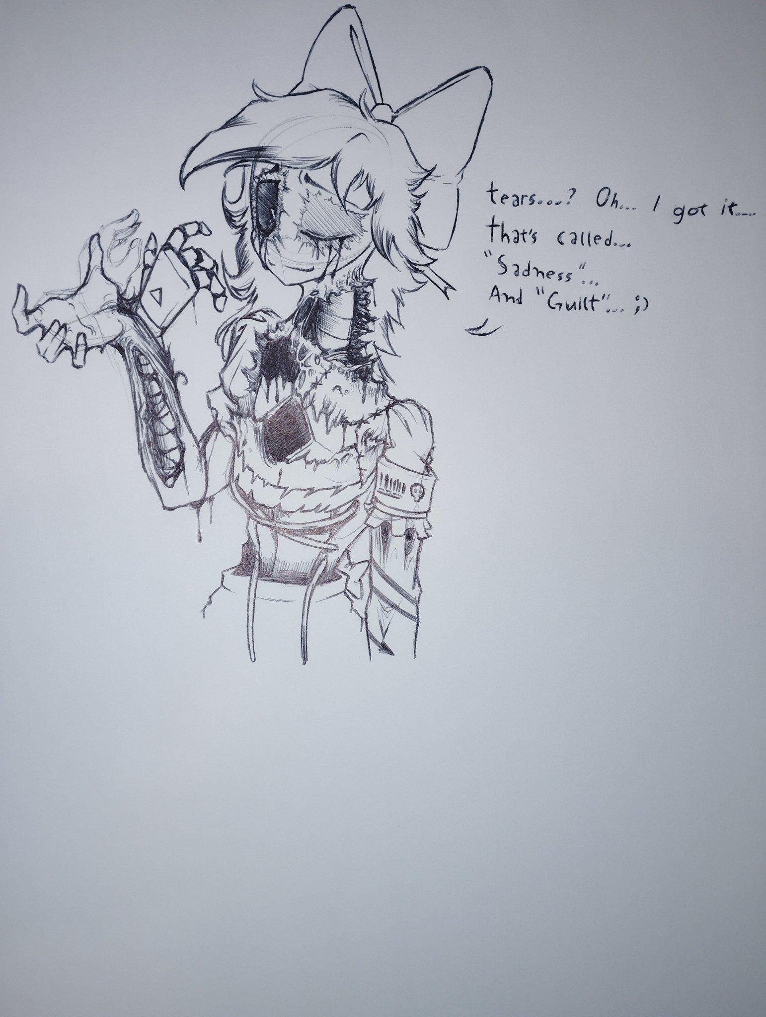 Quick doodle I can't make properly cause I can't draw humans I had an explanation for why her og head was fixed/still has damage back when I came up with the idea but I forgot it, bandages cause it looks cute/sad and Uzi had them too, no antlers yet because new Helmstedt