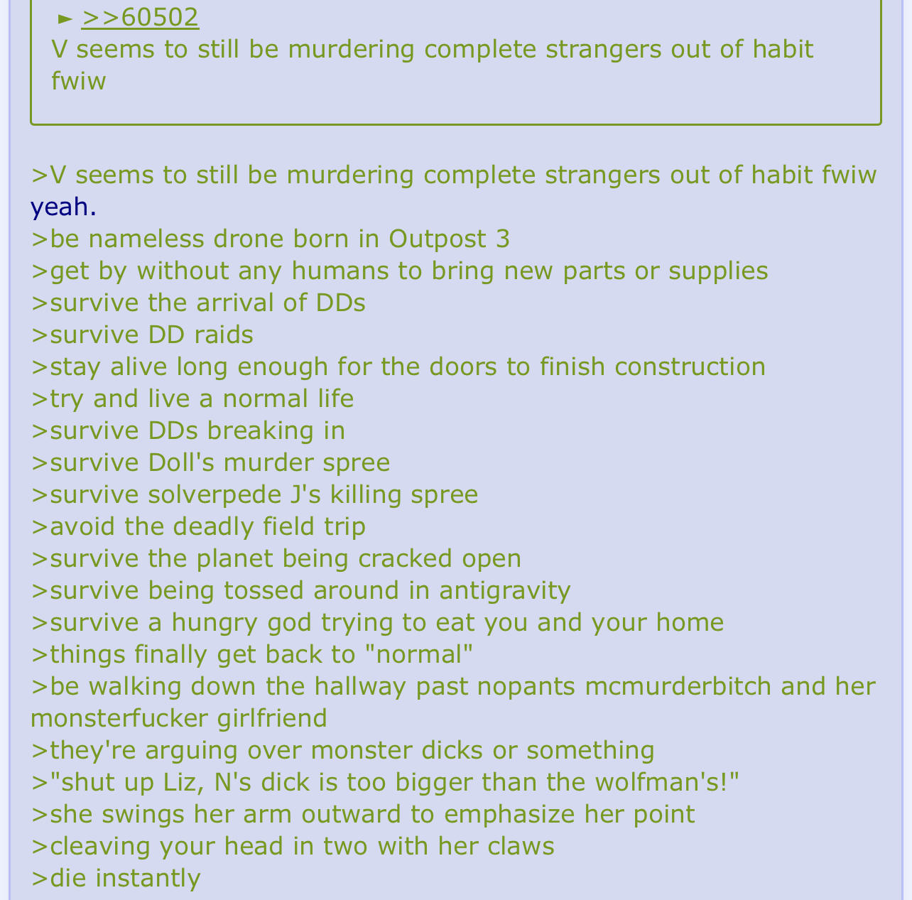 at this point the outpost 3 bots wouldn't even react if a normal worker drone turned into a psycho slasher, would they? they've already been subjected to all manners of supernatural horrors and even after the "good ending" they're left at the mercy of 3 superpowered cannibals that kill them for fun. what's a normal-ass worker with a knife gonna do that's anywhere near as scary?