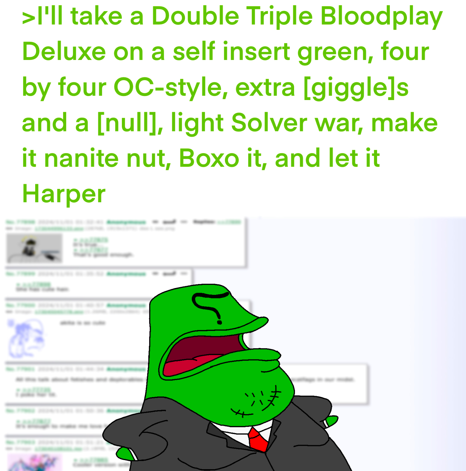 A B-Movie Greentext I'm so sorry this is the only way I could possibly spin SD-M & Oogi >Serial Designation M is tired of being bullied by her squad SD-M: "I've had enough! I'll prove to Zeta and Xi that I'm just as good as them!" >She boldly goes to meet the Disassembly Drones coordinator in charge of all the missions SD-M: "Anon, I demand that you give me your most dangerous mission!" >Anon turned to face SD-M, his face shifting into an expression of pure unadulterated horror, complete with trembling lips, watering eyes & sweat oozing from his brow like a freshly squeezed citrus Anon: "M, I-" SD-M: "TELL ME, OR SO HELP ME ILL KICK YOUR MONKEY-FIGHTING ASS!" Anon: "...Okay. There is a house that's been infested by an evil menace." >SD-M started to go there until Anon stopped her Anon: "Beware M, if you take this quest you'll surely die!" SD-M: "Watch me." >SD-M gives Anon a nut-shattering that nearly kills him before heading to the house for real - >Arriving at the house, SD-M smashes down the door, fully prepared to face evil incarnate >Yet all that awaits her is a simple middle-class Western suburban living room... with a tiny creature creature sitting on the far side coffee table Oogi: "[Oogi noise]?" >SD-M stares in disbelief as she marches towards the tiny critter >Surely this cannot be THIS easy SD-M: "Are you the evil which I have been sent to kill?" Oogi: "[Oogi noise]!" >Not taking such a boorish insult lightly, SD-M clenches Oogi in her hyper-realistic fists >But before she can go in for the kill, Oogi let's put a call for help Oogi: "Eeeeeee!" >Suddenly a chorus of "Bit me!" rings through the halls of the house, followed by a veritable legion of Oogis rushing into the fray SD-M: "What the heck?" >SD-M tries to counter attack, but the torrent of miniature railgun blasts combined with a femcel stench that rates a 0.9 on the Uzi scale SD-M: "Argh, damn you!" >She tried to make for the door but finds herself blinded & crippled from the Oogi onslaught >Their cumulative damage far outpaces her ability to regenerate, and by the time the smoke clears there is nothing left but her boy-boots, ashes, and an M-shaped skeleton >Serial Designation M is now dead [until the next greentext she's in] >As for the Oogis, they had the house all cleaned up in time for Cthulanon to get back home from a shopping so insane that it'd require a multi-post saga to retell properly