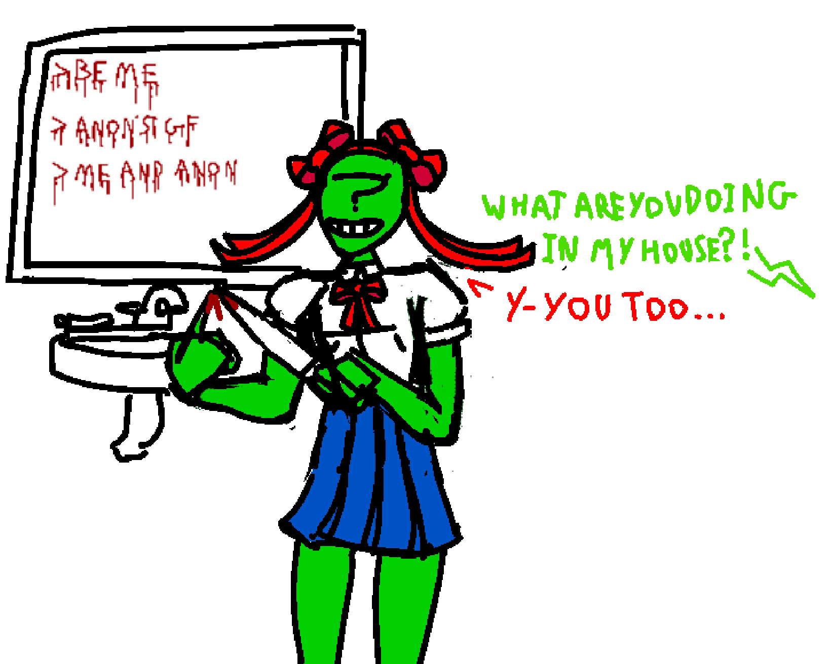 >>80457 >yandere!anon >go to the Chan Nebula on vacation >weird faceless green girl becomes obsessed with you and follows you back home >you find greentexts about you and her in various lewd and/or disturbing scenarios scrawled on your bathroom mirror