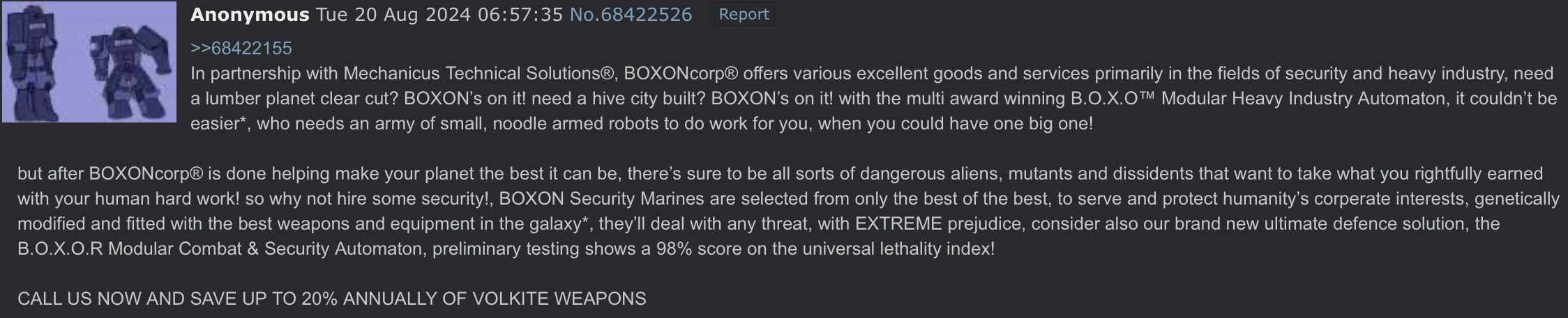 >>80758 >Production of Boxo 2 was discontinued shortly after his introduction >Not because of any inherent flaws, but because people impulsively wanted to try and lick the smooth, blue-green surfaces of his armor >It made him very uncomfortable and also gave them mild bouts of paint induced illness
