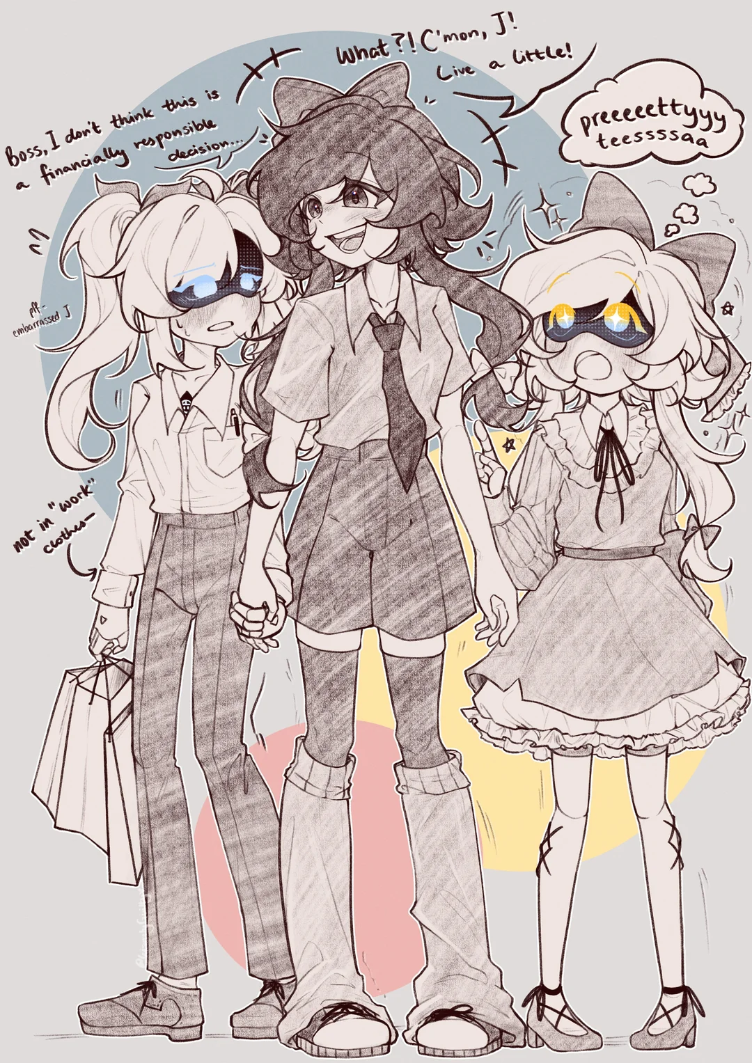 And V's cat thing may have started as a silly thing the fans did like 'N's a dog, so V's a cat' to the point that one of the new plushes GLITCH is releasing is a Cat V, but I think it goes deeper. She's very standoffish, seems to have no real interest in what N or Uzi do, and enjoys lazing around when she's not eating or hunting something. But she's always around them, doing things to get attention, and pretends it's just a coincidence that she's watching the same thing you are, on your phone, with no one else around, shut up, it's not deep. And when you manage to learn to understand how she works, she's deeply affectionate, and friendly, even if she's still a little bitchy.