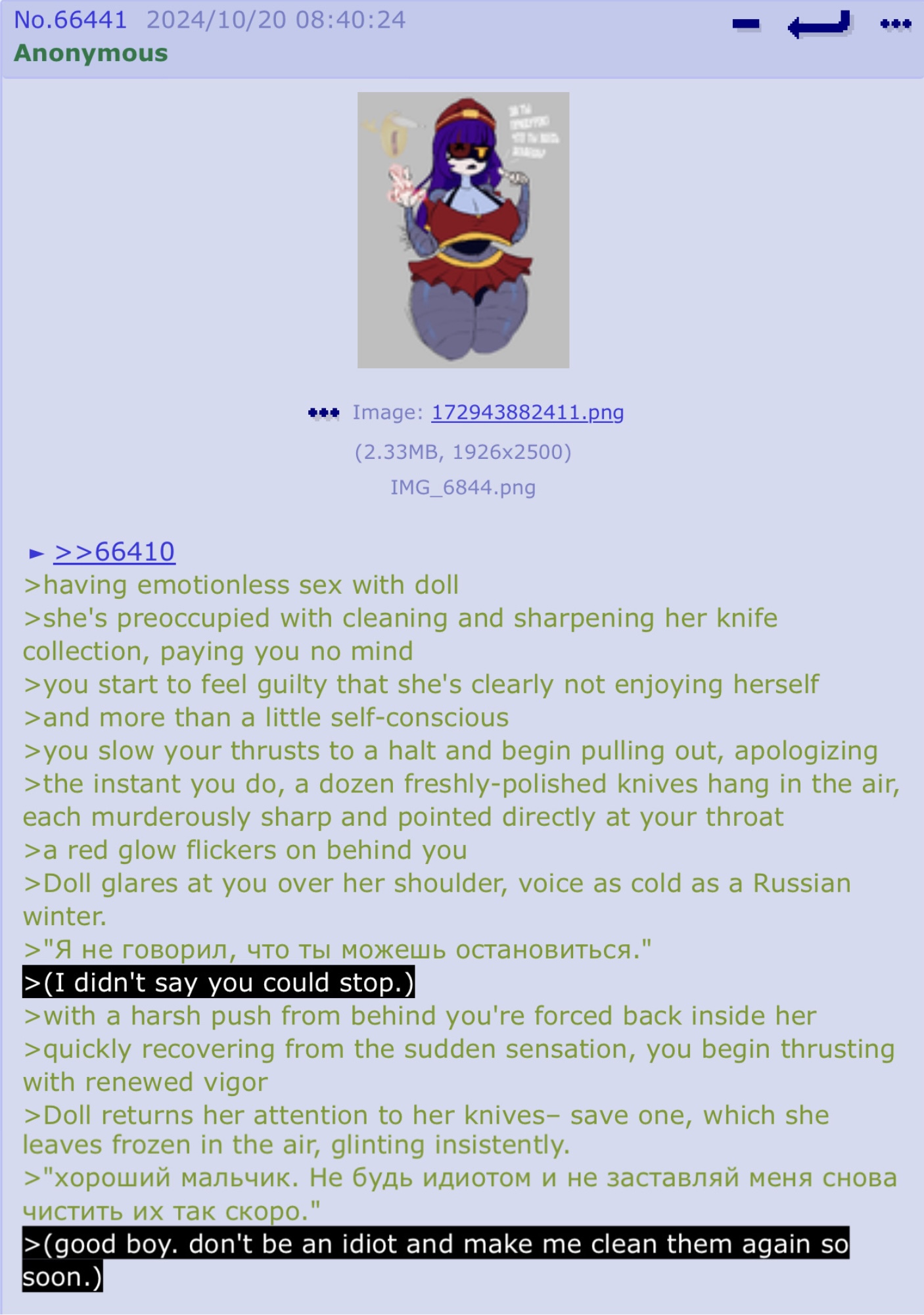 >>85061 >Try to tell Doll you don't have an adapter installed >A closet door pops open and out floats- dear god >What is that... thing meant to adapt to? >Is there even enough oil in your chassis to fill it?