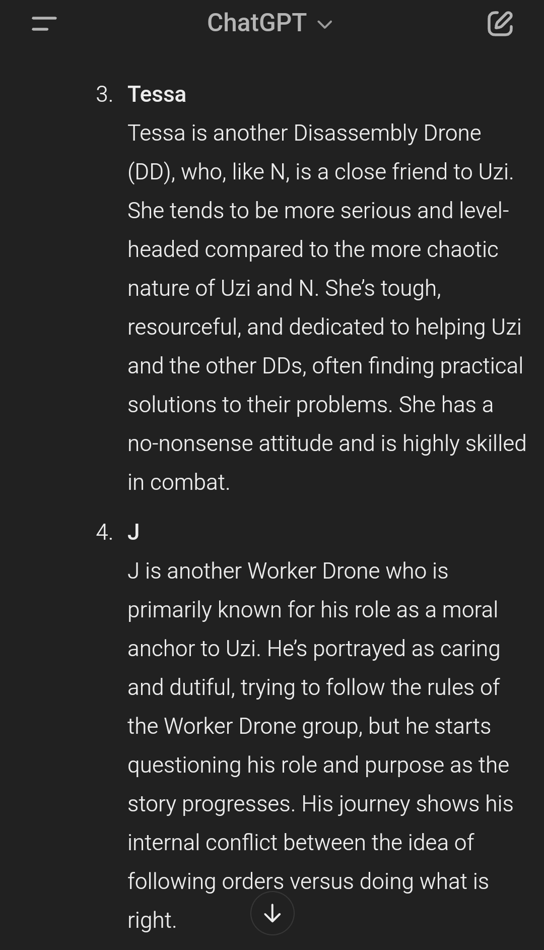 Chatgpt knows Uzi, N and Sentinels pretty well, but J and Tessa are apparently from an AU. I asked for which characters it knows, weirdly enough V was not listed. Only Uzi, N, Tessa, J, Sentinels and WDs, who it said were the antagonists of the show. It isn't good for learning what happens in the show ofc but such stuff it still entertaining, seems Tessa and J have more online presence than V and even Cyn. Its info is of course outdated, but even back then V was way more relevant than J.