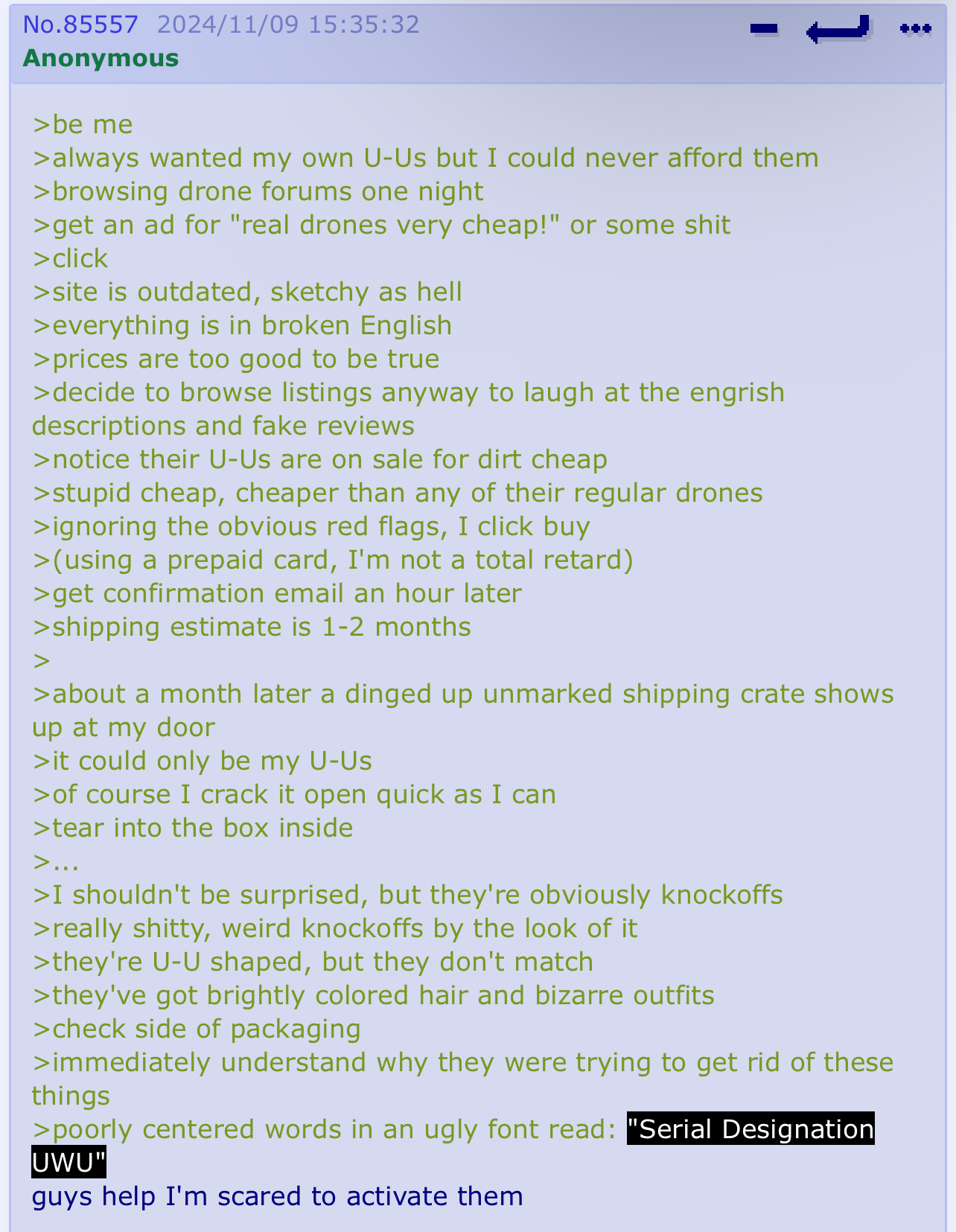 Good morning, new thread for drones since last is pretty full already. You know how this goes wawawa Booru of droens: dronebooru.co Wheel for our OCs: wheelofnames.com/8hc-stc Writing prompt wheel: wheelofnames.com/dmz-9uc Last thread: >>86036